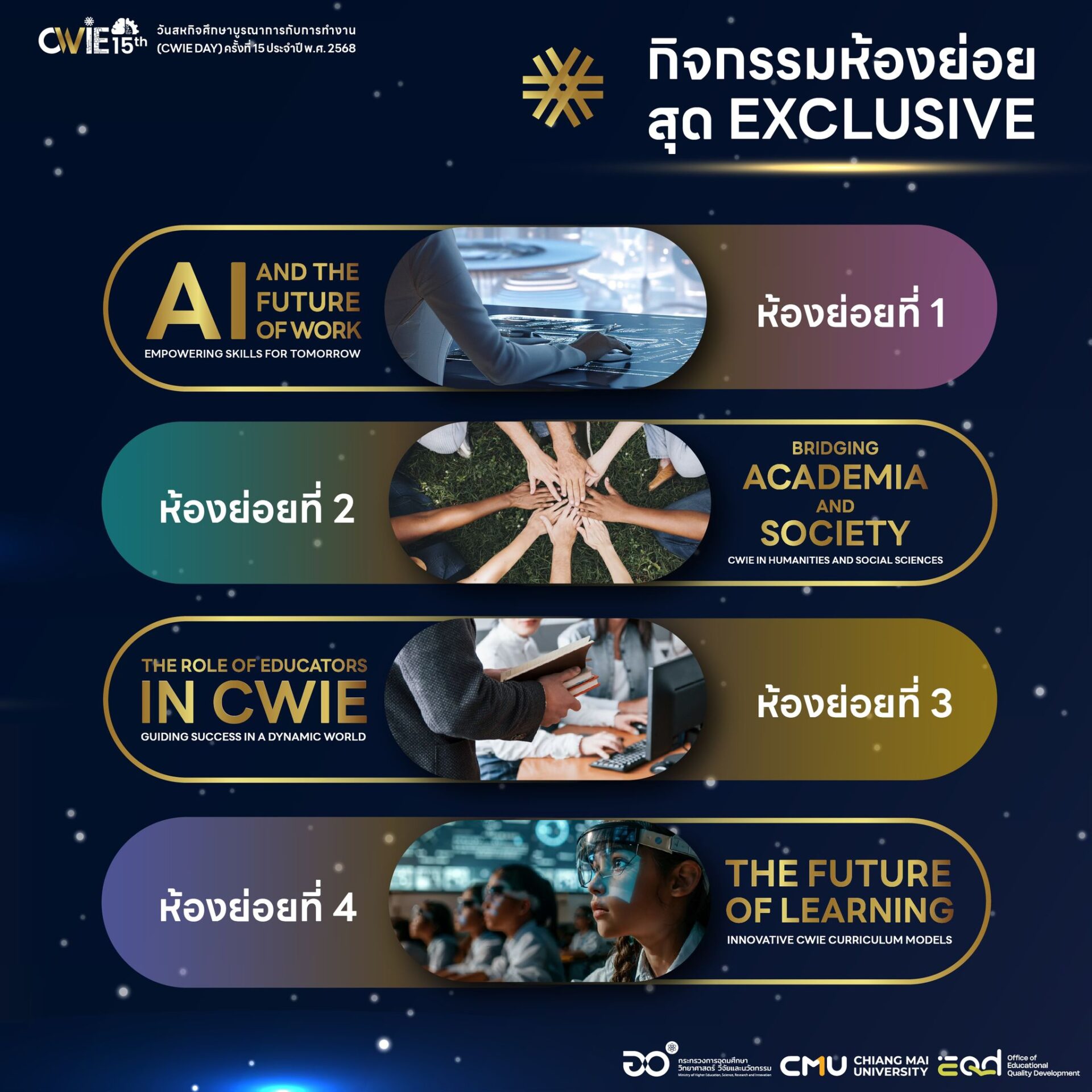 มากไปกว่านั้นยังมีการจัด Exclusive Sessions หรือ Breakout rooms ที่ผู้เข้าร่วมสามารถเลือกเข้าร่วมตามความสนใจ ได้แก่ AI and the Future of Work ทักษะแห่งอนาคตในยุค AI, Bridging Academia and Society CWIE กับมนุษยศาสตร์และสังคมศาสตร์, The Role of Educators in CWIE บทบาทของคณาจารย์นิเทศ CWIE และThe Future of Learning นวัตกรรมหลักสูตร CWIE ปิดท้ายด้วยพิธีมอบรางวัล CWIE ดีเด่น ระดับชาติ