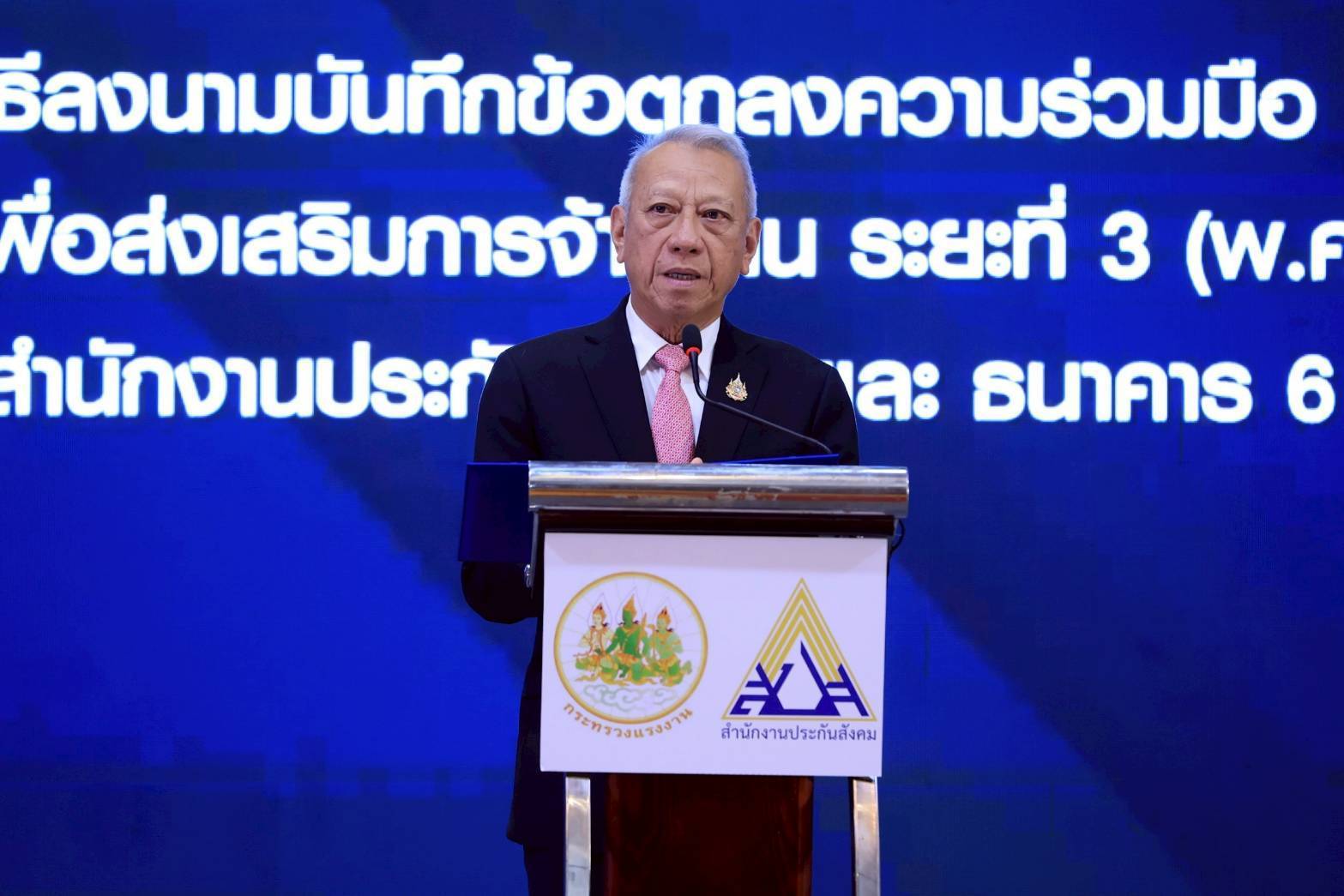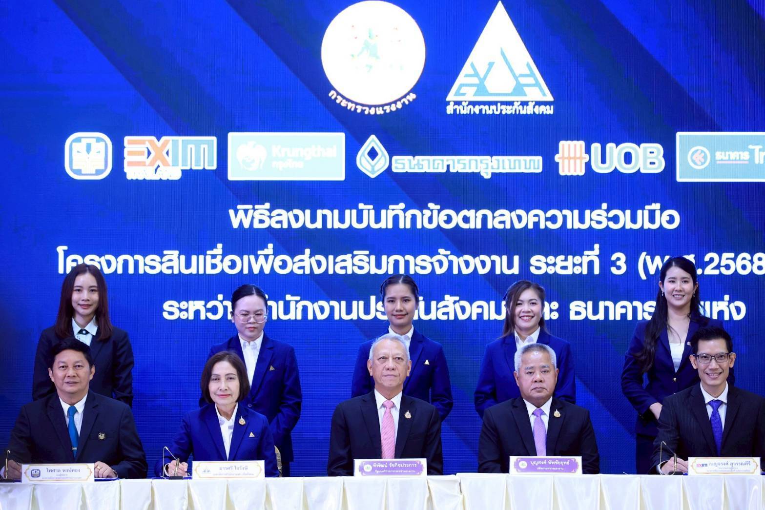 วันที่ 29 พฤษภาคม 2568 นายพิพัฒน์ รัชกิจประการ รัฐมนตรีว่าการกระทรวงแรงงาน เป็นประธานและสักขีพยานในพิธีลงนามบันทึกข้อตกลงความร่วมมือในโครงการสินเชื่อเพื่อส่งเสริมการจ้างงาน ระยะที่ 3 (พ.ศ. 2568 – 2569) ระหว่างสำนักงานประกันสังคม ร่วมมือกับ ธนาคารเพื่อการเกษตรและสหกรณ์การเกษตร ธนาคารเพื่อการส่งออกและนำเข้าแห่งประเทศไทย ธนาคารกรุงไทย จำกัด (มหาชน) ธนาคารกรุงเทพ จำกัด (มหาชน) ธนาคารยูโอบี จำกัด (มหาชน) และธนาคารไทยเครดิต จำกัด (มหาชน) โดยมี นายบุญสงค์ ทัพชัยยุทธ์ ปลัดกระทรวงแรงงาน นางมารศรี ใจรังษีเลขาธิการสำนักงานประกันสังคม คณะกรรมการสำนักงานประกันสังคม คณะผู้บริหารกระทรวงแรงงาน คณะผู้บริหารธนาคารที่เข้าร่วมโครงการทั้ง 6 แห่ง ผู้แทนสภาหอการค้าแห่งประเทศไทย ผู้แทนสมาพันธ์เอสเอ็มอีไทย แขกผู้มีเกียรติ สื่อมวลชน และเจ้าหน้าที่สำนักงานประกันสังคม ให้การต้อนรับ ณ ห้องประชุมวายุภักษ์ แกรนด์บอลรูม ชั้น 4 โรงแรมเซ็นทารา ไลฟ์ ศูนย์ราชการและคอนเวนชันเซ็นเตอร์ แจ้งวัฒนะ กรุงเทพมหานคร