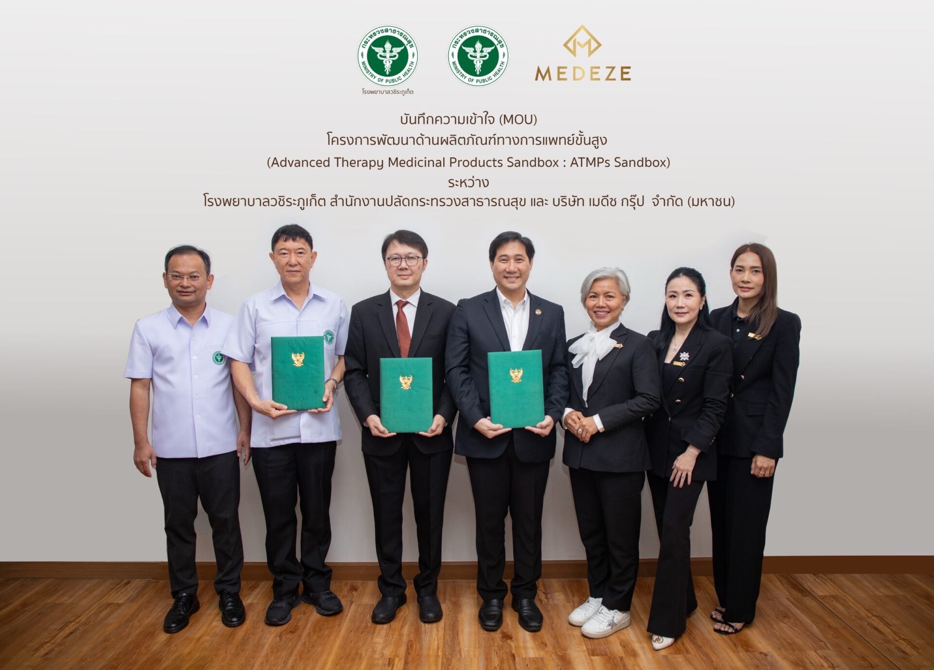 นายแพทย์ปิยะ ศิริลักษณ์ ผู้ตรวจราชการกระทรวงสาธารณสุข เขตสุขภาพที่ 11 ปฏิบัติราชการแทนปลัดกระทรวงสาธารณสุข เปิดเผยว่า โครงการ Advanced Therapy Medicinal Products Sandbox (ATMPs Sandbox) มีวัตถุประสงค์เพื่อสร้างระบบต้นแบบของการผลิตและใช้ผลิตภัณฑ์ทางการแพทย์ขั้นสูง (Advanced Therapy Medicinal Products: ATMPs) ที่ได้มาตรฐานสากลและสามารถนำมาใช้จริงในระบบสาธารณสุขไทย ด้วยเป้าหมายเพื่อเพิ่มโอกาสในการเข้าถึงการรักษาที่ทันสมัยและมีประสิทธิภาพในราคาที่เหมาะสม โดยไม่ต้องพึ่งพาการนำเข้าจากต่างประเทศ ทั้งนี้ คณะกรรมการโครงการฯ ได้คัดเลือก บริษัท เมดีซ กรุ๊ป จำกัด (มหาชน) หรือ MEDEZE เป็นบริษัทเดียวในการนำร่อง เพราะมีคุณสมบัติพร้อมสุด ตอบโจทย์การพัฒนาประเทศ ถือว่าเป็นที่น่ายินดีว่ามีบริษัทของคนไทยที่ได้มาตรฐานสากลมาร่วมมือในครั้งนี้ด้วย