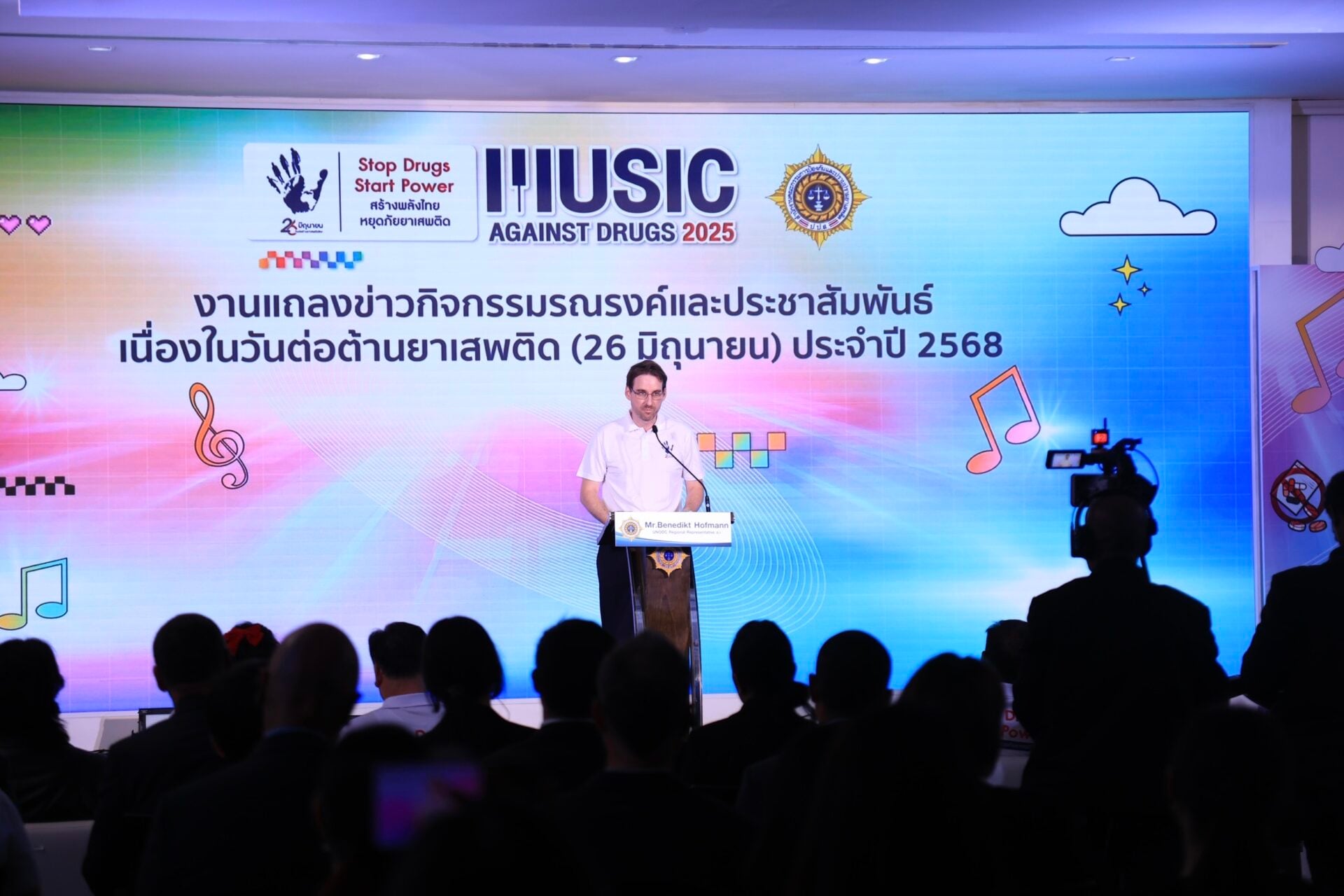วันที่ 6 มิถุนายน 2568 เวลา 10.00 น. พล.ต.ท.ภาณุรัตน์ หลักบุญ เลขาธิการคณะกรรมการป้องกัน และปราบปรามยาเสพติด (เลขาธิการ ป.ป.ส.) พร้อมด้วยนายมานะ ศิริพิทยาวัฒน์ รองเลขาธิการ ป.ป.ส. นางสาวอารีภักดิ์ เงินบำรุง รองเลขาธิการ ป.ป.ส. นายเบเนดิกต์ ฮอฟมันน์ (Mr. Benedikt Hofmann) ผู้แทนสำนักงานว่าด้วยยาเสพติดและอาชญากรรมแห่งสหประชาชาติ (United Nations Office on Drugs and Crime: UNODC) ประจำภูมิภาคเอเชียตะวันออกเฉียงใต้และแปซิฟิก นายฮันเตอร์ แมคจี (Mr. Hunter McGee) รองประธาน FANC และคณะเจ้าหน้าที่ประสานงานยาเสพติดต่างประเทศประจำประเทศไทย (Foreign Anti-Narcotics Community-FANC) แถลงข่าวกิจกรรมรณรงค์และประชาสัมพันธ์เนื่องในวันต่อต้านยาเสพติดโลก (26 มิถุนายน) ประจำปี 2568 คอนเสิร์ตต่อต้านยาเสพติด Music Against Drugs 2025 ภายใต้คำขวัญ “Stop Drugs, Start Power สร้างพลังไทย หยุดภัยยาเสพติด” อีกทั้ง 2 ศิลปินชื่อดัง แพท พาวเวอร์แพท และ Indigo ร่วมเสวนาหัวข้อ “ดนตรีสร้างพลังใจ หยุดภัยยาเสพติด” ณ ห้องประชุมชิดชัยฯ สำนักงาน ป.ป.ส. (ดินแดง)