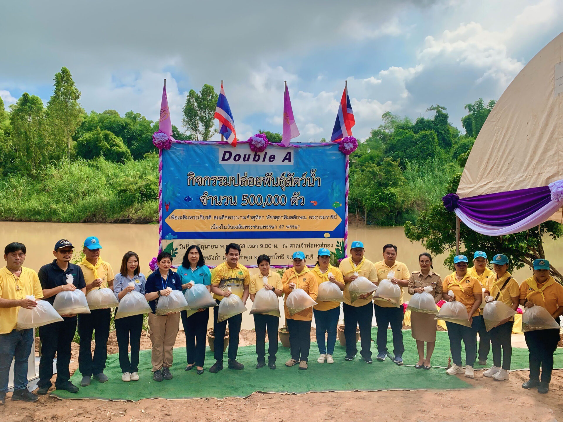 ดั๊บเบิ้ล เอ จัดกิจกรรมปล่อยพันธุ์สัตว์น้ำเพื่อเฉลิมพระเกียรติสมเด็จพระนางเจ้าสุทิดา พัชรสุธาพิมลลักษณ พระบรมราชินี เนื่องในวันเฉลิมพระชนมพรรษาครบ 47 พรรษา โดยมี นางสาวจุฑามาศ บัวเผื่อน นายอำเภอศรีมหาโพธิ เป็นประธานในพิธี พร้อมด้วยผู้แทนจากหน่วยงานราชการ สถานศึกษา องค์กรปกครองส่วนท้องถิ่น บริษัทห้างร้าน ผู้นำชุมชนและประชาชนในพื้นที่ ได้ร่วมปล่อยพันธุ์ปลาและพันธุ์กุ้งรวม 500,000 ตัว ลงสู่แม่น้ำปราจีนบุรี ณ บริเวณท่าน้ำศาลจ้าพ่อหงส์ทอง ต.ท่าตูม อ.ศรีมหาโพธิ จ.ปราจีนบุรี เพื่อช่วยรักษาระบบนิเวศทางน้ำ เพิ่มความอุดมสมบูรณ์ของแหล่งน้ำธรรมชาติ และเป็นแหล่งอาหารที่ยั่งยืนให้แก่ชุมชน สะท้อนถึงความร่วมมือของทุกภาคส่วนในการดูแลสิ่งแวดล้อม และตระหนักถึงคุณค่าของทรัพยากรธรรมชาติ