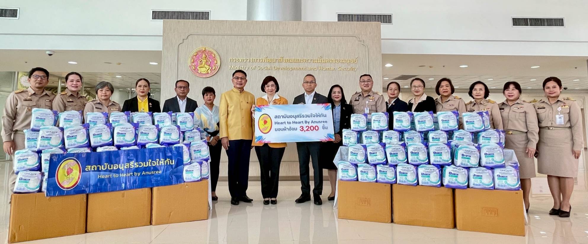 นางสาวอนุสรี ทับสุวรรณ ประธานสถาบันอนุสรีรวมใจให้กัน พร้อมด้วย ดร.ชูวิทย์ มิตรชอบ รองผู้อำนวยการองค์การบริหารการพัฒนาพื้นที่เศษเพื่อการท่องเที่ยวอย่างยั่งยืน (องค์การมหาชน) และครอบครัวได้ นำ มอบผ้าอ้อมผู้ใหญ่จำนวน 3,200 ชิ้น ไปมอบให้กับกระทรวงพัฒนาสังคมและความมั่นคงของมนุษย์โดยมี นายอนุกูล ปีดแก้ว ปลัดกระทรวงการพัฒนาสังคมและความมั่นคงของมนุษย์ นางจตุพร โรจนพานิช · รองปลัดกระทรวงการพัฒนาสังคมและความมั่นคงของมนุษย์ นายโชคชัย วิเชียรชัยยะ อธิบดีกรมส่งเสริมและพัฒนาคุณภาพชีวิตผู้พิการ และผู้แทนข้าราชการกระทรวงการพัฒนาสังคมทุกกรมเข้าร่วม รับมอบ ซึ่ง ผ้าอ้อมผู้ใหญ่ จำนวนดังกล่าวจะนำไป เพื่อส่งต่อกลุ่มผู้เปราะบางในความดูแลของกระทรวงการพัฒนาสังคมและความมั่นคงของมนุษย์ที่มีทั้งสถานสงเคราะห์ผู้สูงอายุและผู้พิการทั่วประเทศต่อไป