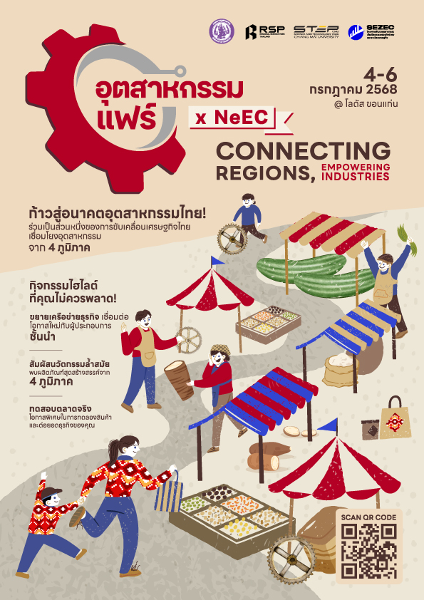 กระทรวงอุตสาหกรรม ขอเชิญร่วมงาน “อุตสาหกรรมแฟร์ X NeEC” งานแสดงศักยภาพผลิตภัณฑ์ไทยที่ได้รับการพัฒนาและยกระดับด้วยนวัตกรรม เทคโนโลยี และภูมิปัญญาท้องถิ่น ภายใต้แนวคิด “เชื่อมโยงเศรษฐกิจ สร้างสรรค์คุณค่า พัฒนาที่ยั่งยืน” ภายใต้โครงการพัฒนาอุตสาหกรรมเชื่อมโยงเขตเศรษฐกิจพิเศษและระเบียงเศรษฐกิจพิเศษ ดำเนินการโดยสำนักงานอุตสาหกรรมจังหวัดเชียงใหม่ ร่วมกับอุทยานวิทยาศาสตร์และเทคโนโลยี มหาวิทยาลัยเชียงใหม่ (STeP) โครงการที่มุ่งพัฒนาและเชื่อมโยงห่วงโซ่การผลิตและบริการของอุตสาหกรรมเป้าหมายในพื้นทีระเบียงเศรษฐกิจพิเศษของประเทศไทย ทั้ง 4 ภาค อันได้แก่ ระเบียงเศรษฐกิจภาคตะวันออกเฉียงเหนือ (NeEC), ระเบียงเศรษฐกิจภาคเหนือ (NEC), ระเบียงเศรษฐกิจภาคกลาง-ตะวันตก (CWEC) และระเบียงเศรษฐกิจภาคใต้ (SEC) ผ่านการส่งเสริมการใช้เทคโนโลยีและนวัตกรรมควบคู่กับทุนวัฒนธรรมท้องถิ่น เพื่อยกระดับผลิตภัณฑ์ เพิ่มมูลค่า สร้างโอกาส และกระจายประโยชน์ทางเศรษฐกิจอย่างทั่วถึงและยั่งยืน