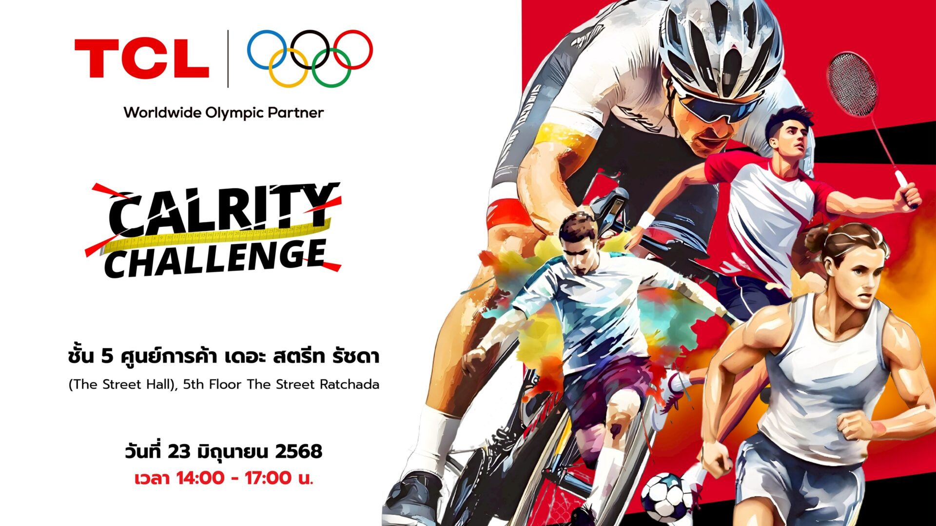 วงในกระซิบ TCL แบรนด์เครื่องใช้ไฟฟ้าเบอร์ต้นๆ ของโลก พันธมิตรอย่างเป็นทางการของมหกรรมกีฬาโอลิมปิก เตรียมจัดโปรเจกต์สุด Exclusive แคมเปญระดับชาติ “CALRITY CHALLENGE เบิร์นเพื่อแบ่งปัน พลังเพื่อสังคม” เฉลิมฉลองวันกีฬาโอลิมปิกสากล (International Olympic Day) อย่างยิ่งใหญ่และไม่เหมือนใคร รวมพลังครั้งใหญ่ของคนรักสุขภาพ เป้าหมายที่ยิ่งใหญ่มากกว่าแค่การออกกำลังกาย ตอกย้ำความสัมพันธ์อันแนบแน่นของ TCL กับมหกรรมกีฬาที่ยิ่งใหญ่ที่สุดในโลก