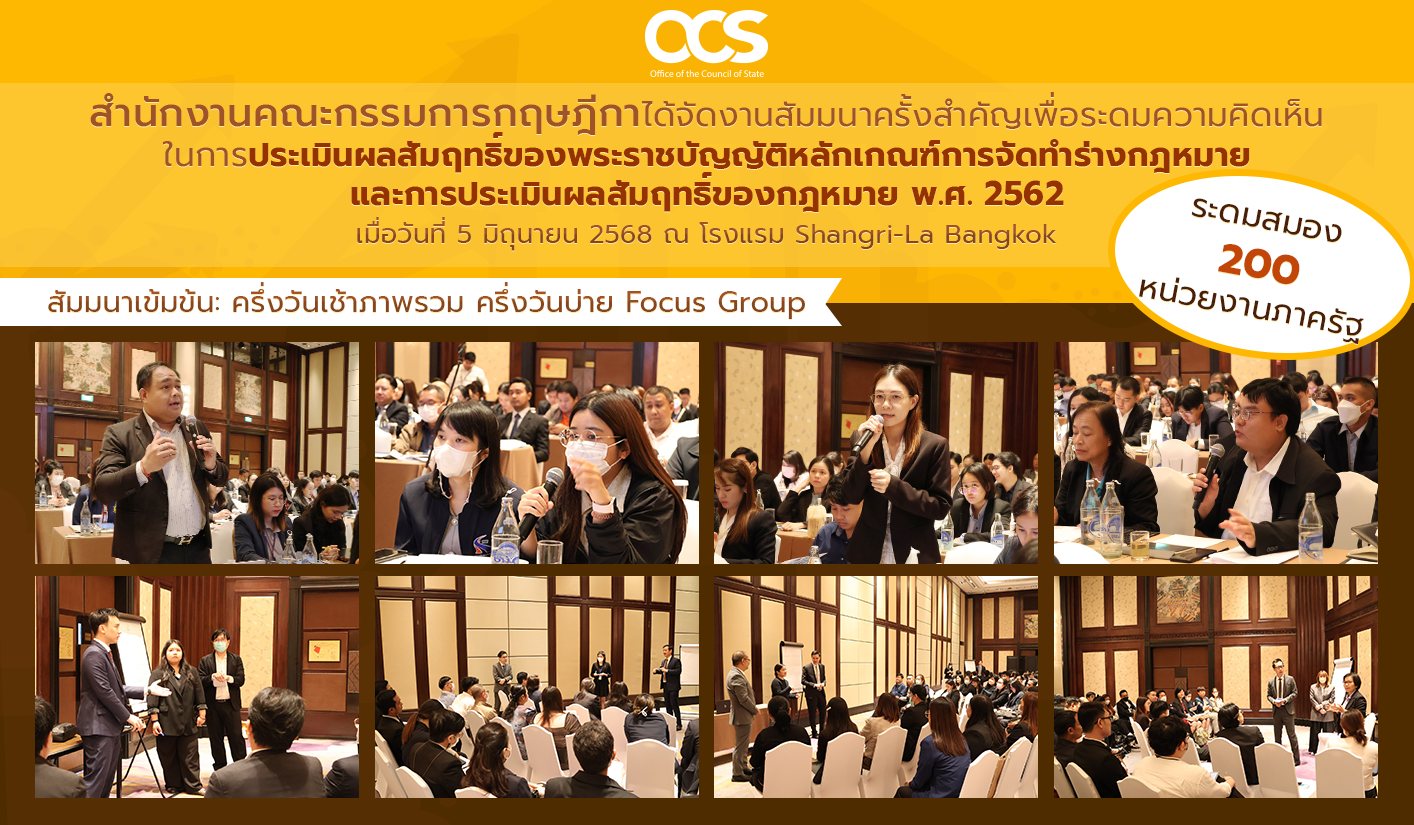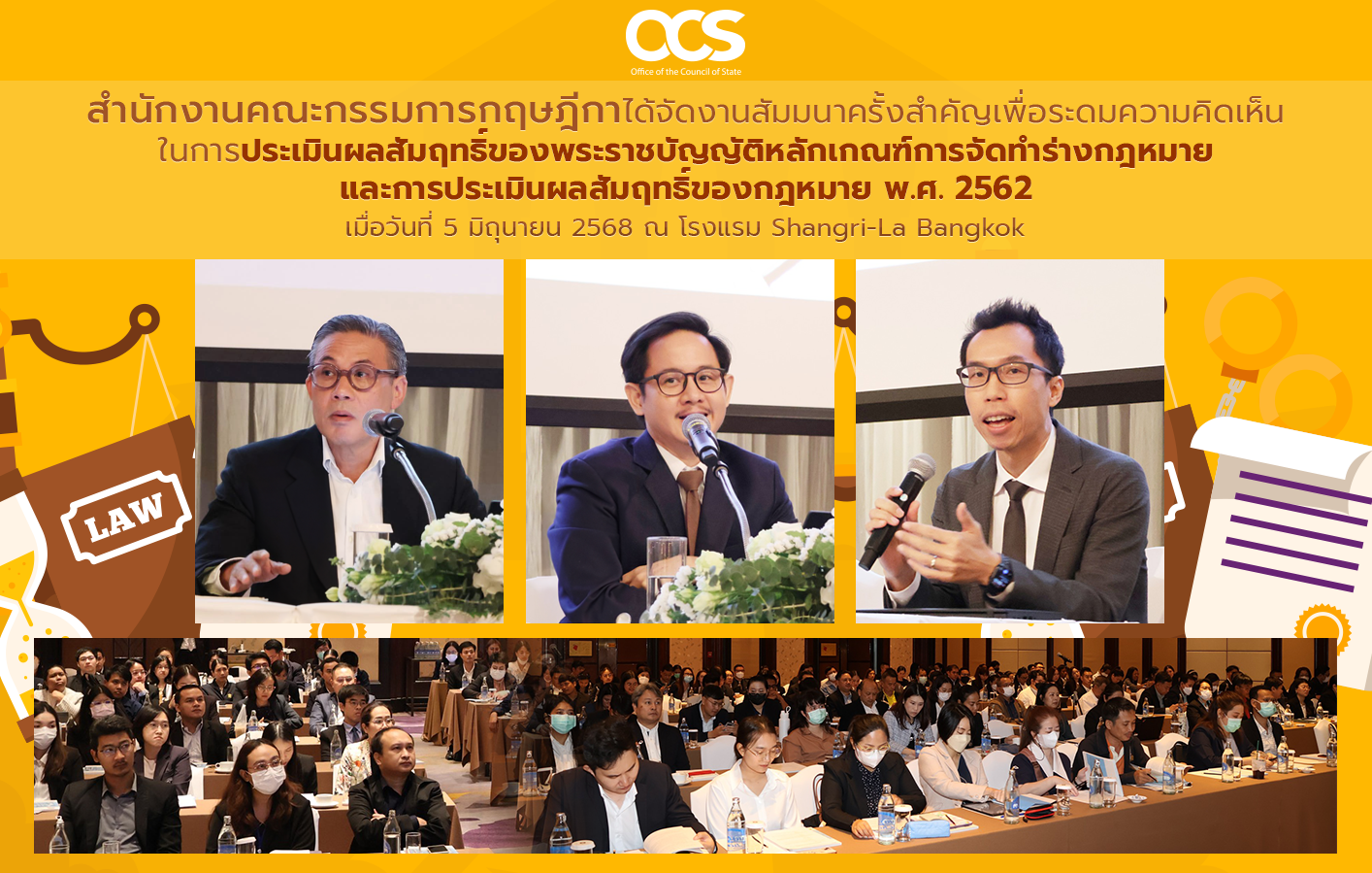 เมื่อวันที่ 5 มิถุนายน 2568 สำนักงานคณะกรรมการกฤษฎีกาได้จัดงานสัมมนาครั้งสำคัญ ณ โรงแรม Shangri-La Bangkok โดยมีผู้แทนจากหน่วยงานภาครัฐกว่า 200 หน่วยงานเข้าร่วมงานเพื่อระดมความคิดเห็นในการประเมินผลสัมฤทธิ์ของพระราชบัญญัติหลักเกณฑ์การจัดทำร่างกฎหมายและการประเมินผลสัมฤทธิ์ของกฎหมาย พ.ศ. 2562 ซึ่งเป็นหมุดหมายสำคัญในการยกระดับคุณภาพกฎหมายไทยให้ก้าวสู่ระดับสากล
