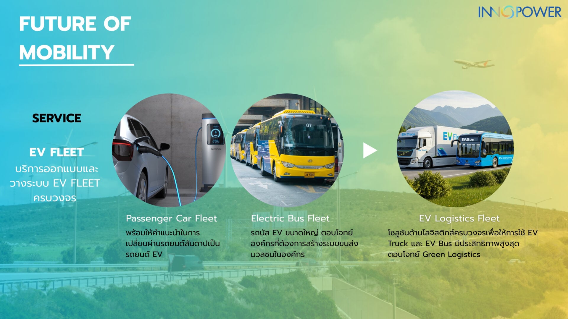 ขณะนี้ บริษัทฯ กำลังเร่งสร้างเครือข่ายความร่วมมือกับผู้ประกอบการโลจิสติกส์ชั้นนำ ผู้ผลิตยานยนต์ไฟฟ้า และผู้ให้บริการบริหารจัดการ Fleet รวมถึงเตรียมความพร้อมด้านโครงสร้างพื้นฐานสถานีชาร์จ พร้อมขยายรองรับการใช้งานจริง โดยอินโนพาวเวอร์มองเห็นโอกาสและศักยภาพในกลุ่มการขนส่งในเมือง