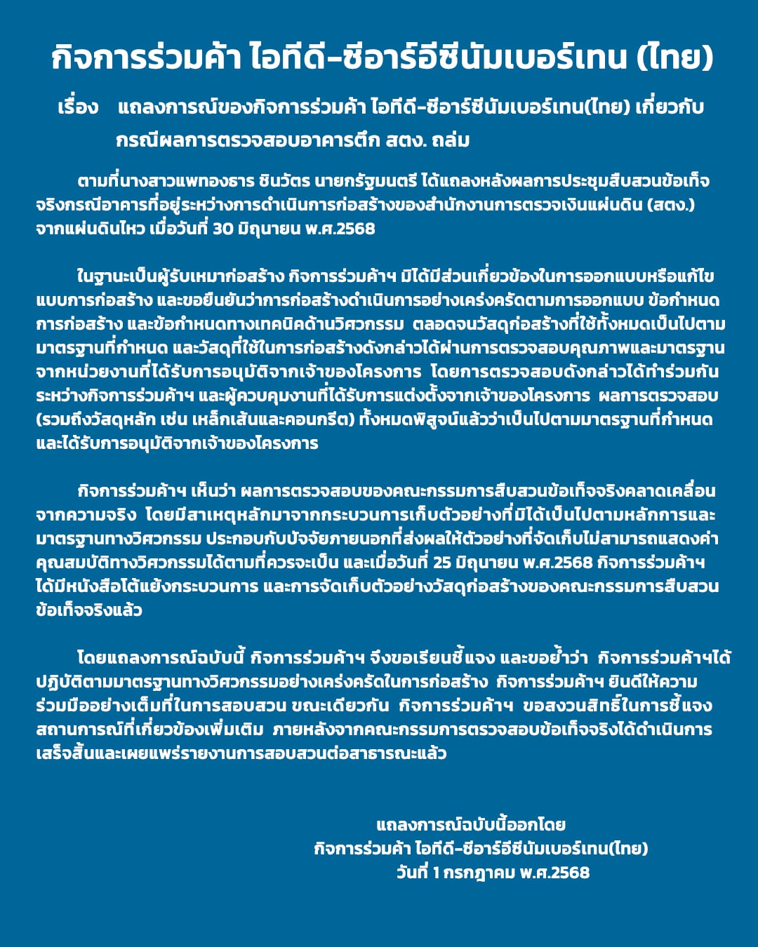 โดยแถลงการณ์ฉบับนี้ กิจการร่วมค้าฯ จึงขอเรียนชี้แจง และขอย้ำว่า กิจการร่วมค้าฯได้ปฏิบัติตามมาตรฐานทางวิศวกรรมอย่างเคร่งครัดในการก่อสร้าง กิจการร่วมค้าฯยินดีให้ความร่วมมืออย่างเต็มที่ในการสอบสวน ขณะเดียวกัน กิจการร่วมค้าฯ ขอสงวนสิทธิ์ในการชี้แจงสถานการณ์ที่เกี่ยวข้องเพิ่มเติมภายหลังจากคณะกรรมการตรวจสอบข้อเท็จจริงได้ดำเนินการเสร็จสิ้นและเผยแพร่รายงานการสอบสวนต่อสาธารณะแล้ว