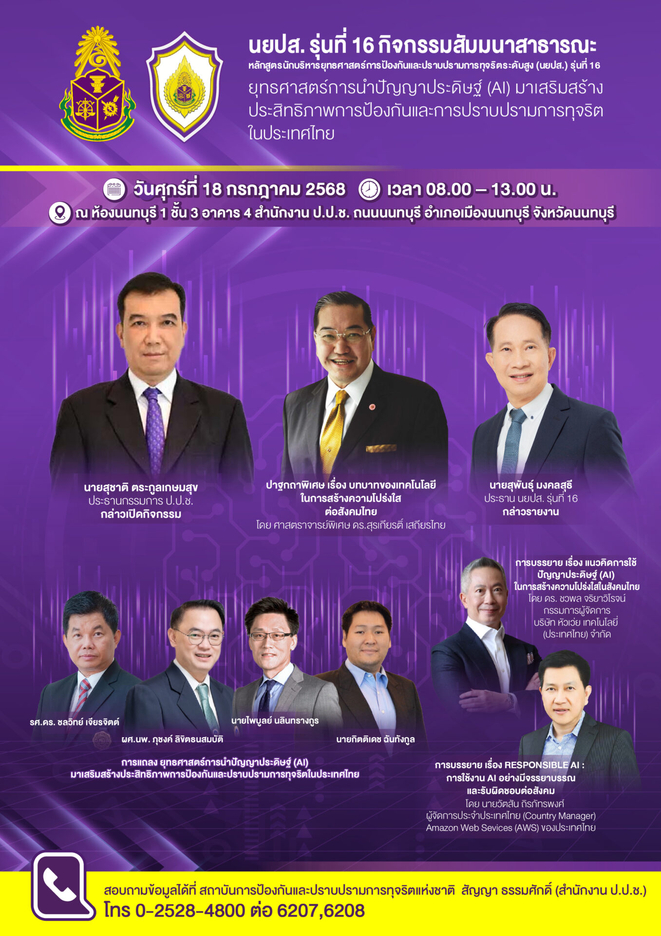 นักบริหารยุทธศาสตร์การป้องกันและปราบปรามการทุจริตระดับสูง (นยปส.) รุ่นที่ 16 สถาบัน การป้องกันและปราบปรามการทุจริตแห่งชาติ สัญญา ธรรมศักดิ์ สำนักงานป.ป.ช. โดยคุณสุพันธุ์ มงคลสุธี ประธาน นยปส.รุ่น16 ขอเชิญร่วมงานสัมมนาสาธารณะหัวข้อ “ยุทธศาสตร์การนำปัญญาประดิษฐ์ (AI) มาเสริมสร้างประสิทธิภาพการป้องกันและปราบปรามการทุจริตในประเทศไทย” พร้อมรับฟังปาฐกถาเรื่อง “บทบาทของเทคโนโลยีในการสร้างความโปร่งใสต่อสังคมไทย” และขอเชิญร่วมรับชมนิทรรศการจากหน่วยงานเครือข่ายและกิจกรรมอีกมากมาย ในวันศุกร์ที่ 18 กรกฎาคม 2568 ตั้งแต่เวลา 08.00 – 12.30 น. ณ ห้องนนทบุรี 1 ชั้น 3 อาคาร 4 สำนักงานป.ป.ช. ถนนนนทบุรี อำเภอเมืองนนทบุรี จังหวัดนนทบุรี