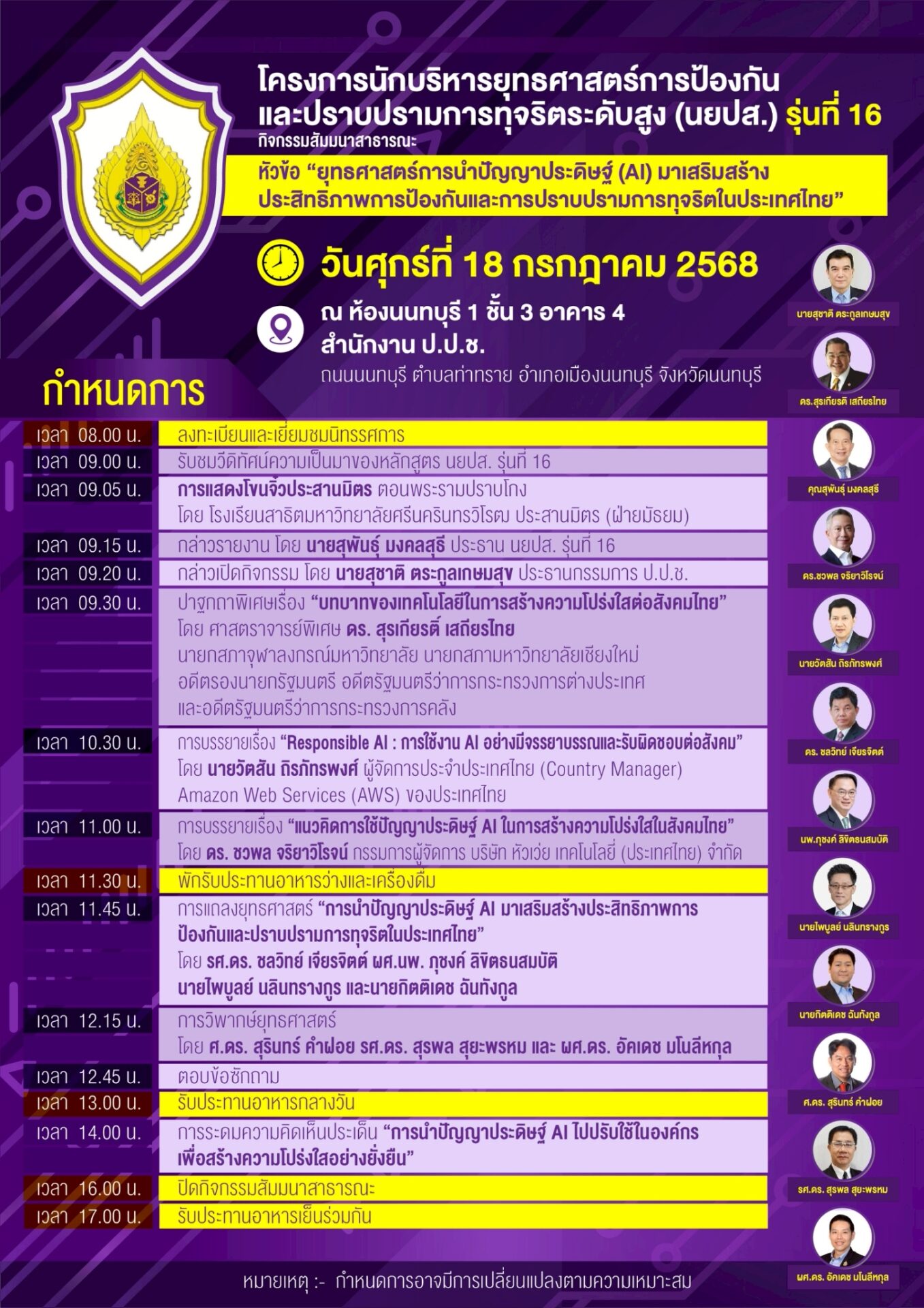 กิจกรรมในครั้งนี้ ได้รับเกียรติจาก นายสุชาติ ตระกูลเกษมสุข ประธานกรรมการ ป.ป.ช. เป็นประธานเปิดงาน พร้อมทั้งการแสดงปาฐกถาโดย ศาสตราจารย์พิเศษ ดร.สุรเกียรติ์ เสถียรไทย เรื่อง“บทบาทของเทคโนโลยีในการสร้างความโปร่งใสต่อสังคมไทย” และการบรรยายพิเศษอีก 2 หัวข้อ ได้แก่ “Responsible AI: การใช้งาน AI อย่างมีจรรยาบรรณและรับผิดชอบต่อสังคม” โดย คุณวัตสัน ถิรภัทรพงศ์ Country Manager (Thailand) Amazon Web Service และ“แนวคิดการใช้ปัญญาประดิษฐ์ (AI) ในการสร้างความโปร่งใสในสังคมไทย” โดย ดร.ชวพล จริยา วิโรจน์ กรรมการผู้จัดการ บริษัท หัวเหว่ยเทคโนโลยี (ประเทศไทย) จำกัด หลังจากนั้น จะเป็นการนำเสนอผลการ ศึกษายุทธศาสตร์รุ่น นยปส.รุ่น 16 เรื่อง“ยุทธศาสตร์การนำปัญญาประดิษฐ์ (AI) มาเสริมสร้างประสิทธิภาพการป้องกัน และปราบปรามการทุจริตในประเทศไทย” โดย ผู้แทนฝ่ายวิชาการ นยปส รุ่น 16 รองศาสตราจารย์ ดร. ชลวิทย์ เจียรจิตต์, ผู้ช่วยศาสตราจารย์ นพ.ภุชงค์ ลิขิตธนสมบัติ และนายไพบูลย์ นลินทรางกูร และวิพากษ์โดยกรรมการผู้ทรงคุณวุฒิ 3 ท่าน ได้แก่ ศ.ดร. สุรินทร์ คำฝอย รศ.ดร. สุรพล สุยะพรหม และ ผศ.ดร. อัคเดช มโนลีหกุลนักบริหารยุทธศาสตร์การป้องกันและปราบปรามการทุจริตระดับสูง” หรือ “นยปสรุ่น 16 หวังเป็นอย่างยิ่งว่ายุทธศาสตร์ที่ได้จากหลักสูตรนี้จะเป็นส่วนหนึ่งในการเสริมสร้างประสิทธิภาพการปองกันและ การปราบปรามการทุจริต ในประเทศไทย และเป็นส่วนหนึ่งในการพัฒนาประเทศให้เข้มแข็งต่อไปในอนาคต