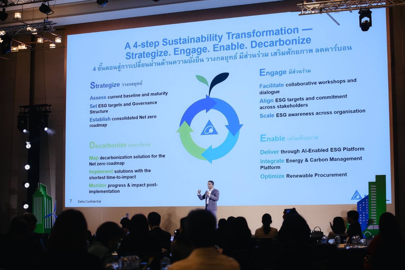 นอกจากนี้ คุณคาร์ธิเกยัน อารุน ที่ปรึกษาอาวุโส สำนักงานที่ปรึกษาด้าน ESG ของเดลต้า อีเลคโทรนิคส์ อิงค์ ยังได้แนะนำกรอบการทำงานด้านการเปลี่ยนผ่านสู่ความยั่งยืน 4 ขั้นของเดลต้า หรือ Delta’s 4-step Sustainability Transformation Framework อันประกอบด้วย การวางกลยุทธ์ (Strategize) การมีส่วนร่วม (Engage) การเสริมสร้างศักยภาพ (Enable) และการลดการปล่อยคาร์บอน (Decarbonize) ซึ่งภาคธุรกิจไทยสามารถนำมาใช้เป็นโรดแมปเพื่อบรรลุเป้าหมายการปล่อยก๊าซเรือนกระจกสุทธิเป็นศูนย์ รวมไปถึงการดำเนินที่สอดคล้องกับมาตรฐาน ESG ระดับโลกได้ คุณคาร์ธิเกยัน อารุน ยังได้นำเสนอเครื่องมือช่วยสนับสนุนการดำเนินงานด้านความยั่งยืนของเดลต้าอีก 2 แบบ ได้แก่ ESG AI Service Portal และ DelZero Digital Platform โดย ESG AI Service Portal เป็นระบบที่ช่วยวิเคราะห์และรายงานผลข้อมูลเชิงลึกด้านความยั่งยืน ทั้งยังสามารถจัดลำดับความสำคัญของประเด็นด้านความยั่งยืนได้อย่างอัตโนมัติ ส่วน DelZero Digital Platform เป็นแพลตฟอร์มที่มีความสามารถในการเก็บรวบรวมข้อมูลอย่างอัจฉริยะ มีฐานข้อมูลเกี่ยวกับปัจจัยการปล่อยก๊าซเรือนกระจกที่ครอบคลุม และมีระบบวิเคราะห์ขั้นสูงที่สามารถติดตามและตรวจสอบการปล่อยก๊าซเรือนกระจกในระดับผลิตภัณฑ์ได้ คุณคาร์ธิเกยัน อารุน ได้จบการนำเสนอด้วยการแสดงวิสัยทัศน์สู่การบรรลุเป้าหมายการปล่อยก๊าซเรือนกระจกสุทธิเป็นศูนย์ของประเทศไทย และบทบาทของเดลต้าในฐานะผู้สนับสนุนหลักของธุรกิจไทย