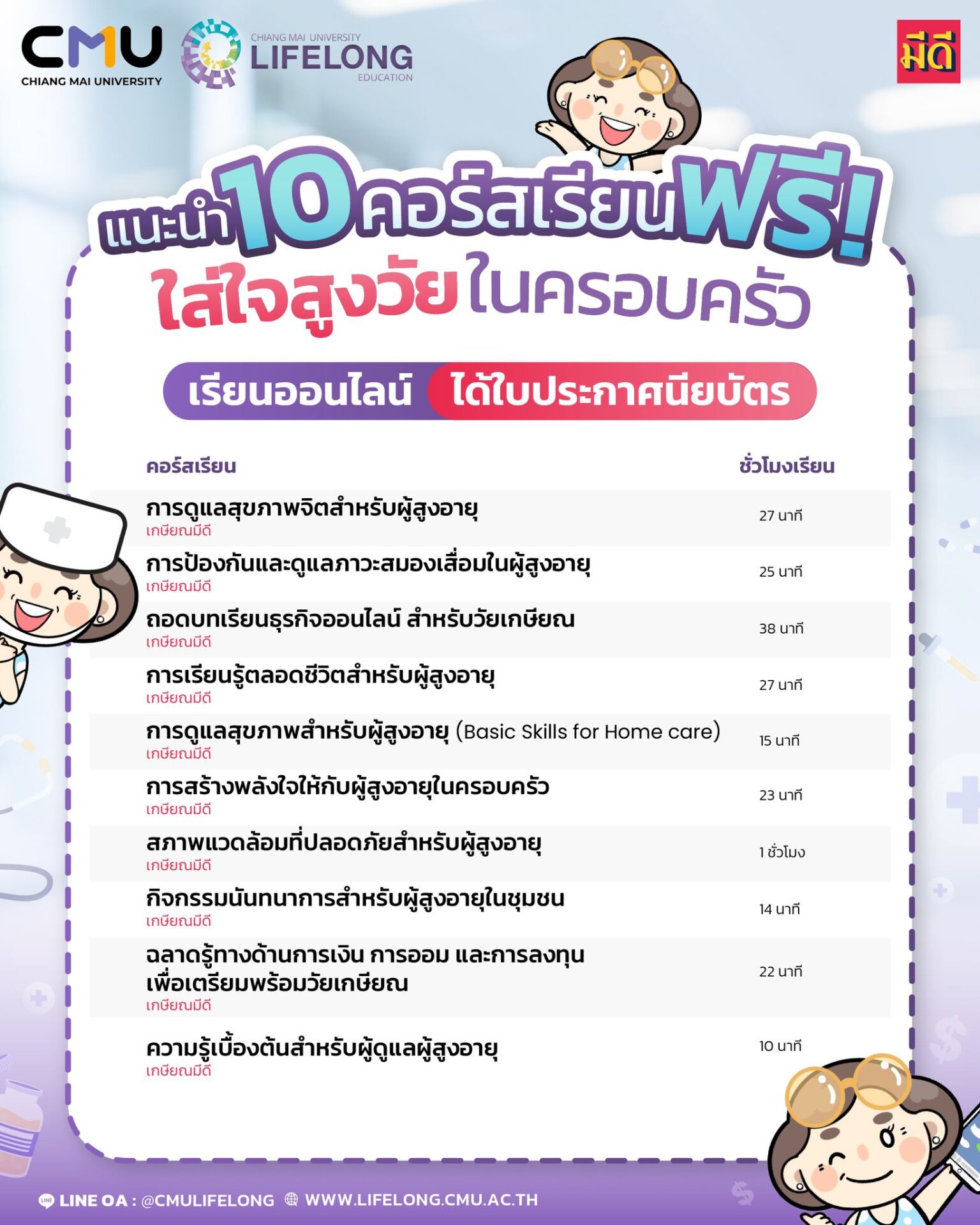 แต่ไม่เพียงแต่ผู้สูงวัยเท่านั้น ยังเรียนได้ทุกเพศทุกวัยฟรี ทุกที่ทุกเวลา ผ่านผ่านเว็บไซต์: https://www.lifelong.cmu.ac.th/medee/ บทเรียนกระชับ เข้าใจง่าย เมื่อจบหลักสูตรแล้วรับใบประกาศนียบัตร (E-Certificate) จากมหาวิทยาลัยเชียงใหม่
