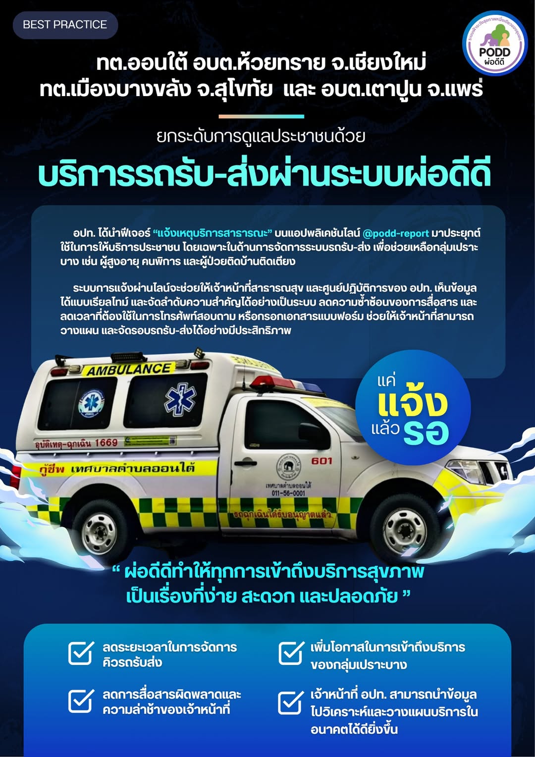 มหาวิทยาลัยเชียงใหม่ โดย ศูนย์เฝ้าระวังสุขภาพหนึ่งเดียว พัฒนาบริการรถรับ-ส่งผู้ป่วยผ่าน “ผ่อดีดี (PODD)” ระบบดิจิทัลเฝ้าระวังสุขภาพคน สัตว์ สิ่งแวดล้อม ภัยธรรมชาติ และสาธารณภัย เป็นเครื่องมือที่สามารถตรวจจับเหตุผิดปกติสุขภาพหนึ่งเดียวได้อย่างรวดเร็ว (Early Detection) โดยอาศัยสมาร์ทโฟนในการรายงาน ประมวลผล และแจ้งข่าวสารอัตโนมัติแบบเรียลไทม์