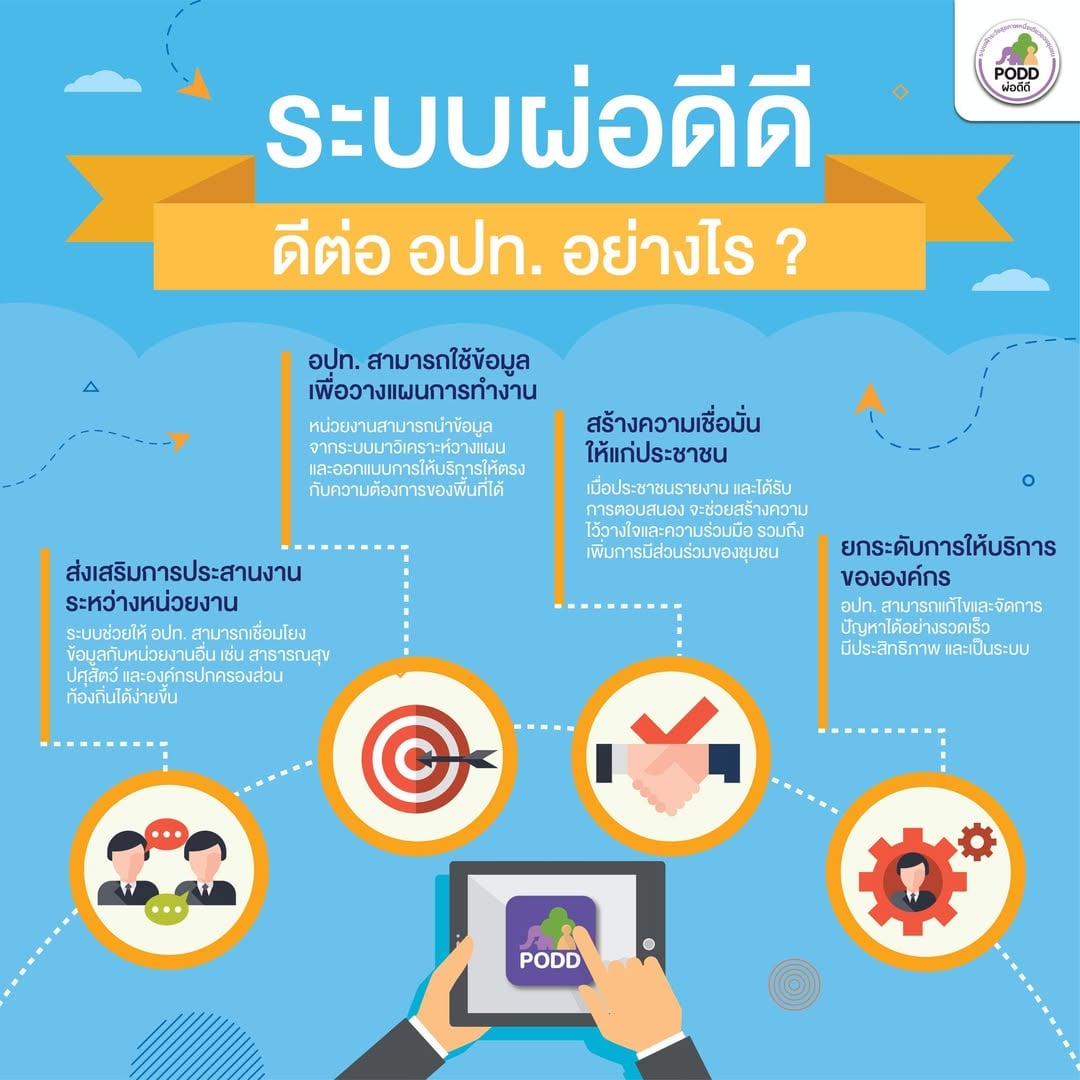 ระบบผ่อดีดี เป็นระบบเฝ้าระวังปัญหาสุขภาพหนึ่งเดียวในชุมชน โดยองค์กรปกครองส่วนท้องถิ่นมีส่วนร่วมในการเป็นเจ้าของ อาศัยการรายงานเหตุผิดปกติสุขภาพหนึ่งเดียว คน สัตว์ สิ่งแวดล้อม และสาธารณภัย จากชาวบ้านในชุมชน ผ่าน 2 ช่องทาง ได้แก่ ไลน์ PODD Report และ แอปพลิเคชันผ่อดีดี โดยผู้แจ้งเหตุจากชุมชน สามารถแบ่งออกเป็น 2 ประเภท ได้แก่ 1. อาสาจัดตั้ง 2. ประชาชนทั่วไปแจ้งเหตุ โดยมีขั้นตอนง่าย ๆ ผ่านแอปพลิเคชันไลน์ “@podd-report” เพียง 1. กดแจ้งเหตุ 2. แชร์พิกัด 3. ใส่รายละเอียด และ 4. แนบรูปภาพ