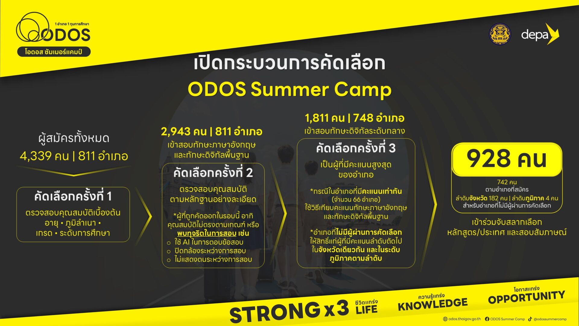 ผศ.ดร.ณัฐพล นิมมานพัชรินทร์ ผู้อำนวยการใหญ่ สำนักงานส่งเสริมเศรษฐกิจดิจิทัล หรือ ดีป้า เปิดเผยว่า ตามที่คณะรัฐมนตรีได้มอบหมายให้ กระทรวงดิจิทัลเพื่อเศรษฐกิจและสังคม โดย ดีป้า เป็นหน่วยงานหลักในการดำเนินโครงการ ODOS Summer Camp ค่ายแห่งโอกาสภาคฤดูร้อน ทุนการศึกษาแบบให้เปล่า จำนวน 928 ทุน ซึ่งมีวัตถุประสงค์เพื่อเปิดโอกาสให้เยาวชนไทยได้มีประสบการณ์การใช้ชีวิตและการศึกษาในมหาวิทยาลัยชั้นนำในต่างประเทศ ระยะเวลา 5 - 6 สัปดาห์ พร้อมยกระดับทักษะดิจิทัลจากเจ้าของเทคโนโลยีที่เป็นบริษัทเทคโนโลยีระดับโลก และค้นหาแรงบันดาลใจเพื่อต่อยอดไปสู่การเลือกสายการเรียนในระดับที่สูงขึ้น รวมไปถึงสายอาชีพในอนาคต โดยขณะนี้ผ่านการคัดเลือกผู้เข้าร่วมโครงการไปแล้ว 3 ครั้งโดยการทดสอบทักษะภาษาอังกฤษและทักษะดิจิทัล ซึ่งมีผู้ผ่านการคัดเลือก 928 คน จาก 878 อำเภอทั่วประเทศ และ 50 เขตในกรุงเทพมหานคร หลังจากนี้ผู้ที่ผ่านการคัดเลือกจะเข้าร่วมกิจกรรมจับสลากเลือกหลักสูตร/ประเทศ และสอบสัมภาษณ์ในวันเสาร์ที่ 26 กรกฎาคมนี้ที่บางกอก คอนเวนชั่นเซ็นเตอร์ ชั้น 22
