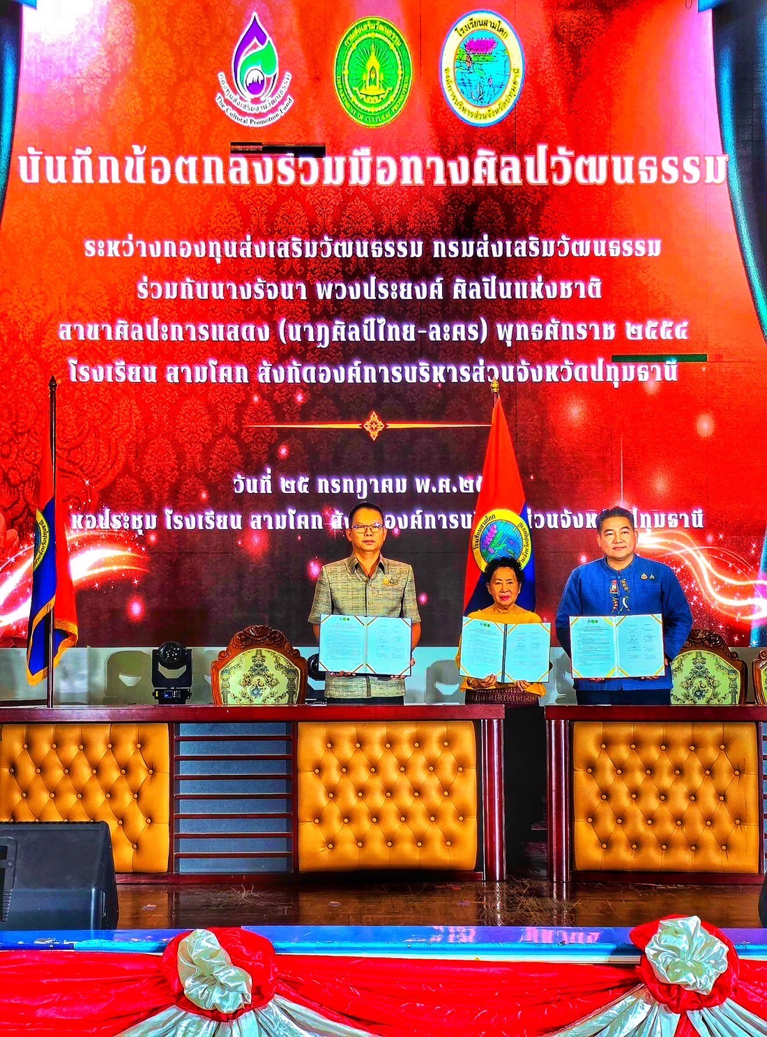 นางนวลพรรณ ล่ำซำ (มาดามแป้ง) ประธานกรรมการกองทุนส่งเสริมงานวัฒนธรรม และนางยุถิกา อิศรางกูร ณ อยุธยา อธิบดีกรมส่งเสริมวัฒนธรรม ผลักดันให้มีการลงนามบันทึกข้อตกลงความร่วมมือทางศิลปวัฒนธรรม (MOU) กับนางรัจนา พวงประยงค์ ศิลปินแห่งชาติ สาขาศิลปะการแสดง (นาฏศิลป์ไทย-ละคร) พุทธศักราช ๒๕๕๔ และโรงเรียนสามโคก โดยมอบหมาย นายอนุกูล ใบไกล ผู้อำนวยการกองกองทุนส่งเสริมงานวัฒนธรรม เป็นผู้แทนเข้าร่วมงาน ทั้งนี้ มีผู้บริหารสมาคมผู้ปกครอง และคณาจารย์โรงเรียนสามโคก โรงเรียนหอวังปทุมธานี โรงเรียนวัดเสด็จ โรงเรียนวัดป่างิ้ว และโรงเรียนในพื้นที่ใกล้เคียง เข้าร่วมเป็นสักขีพยาน