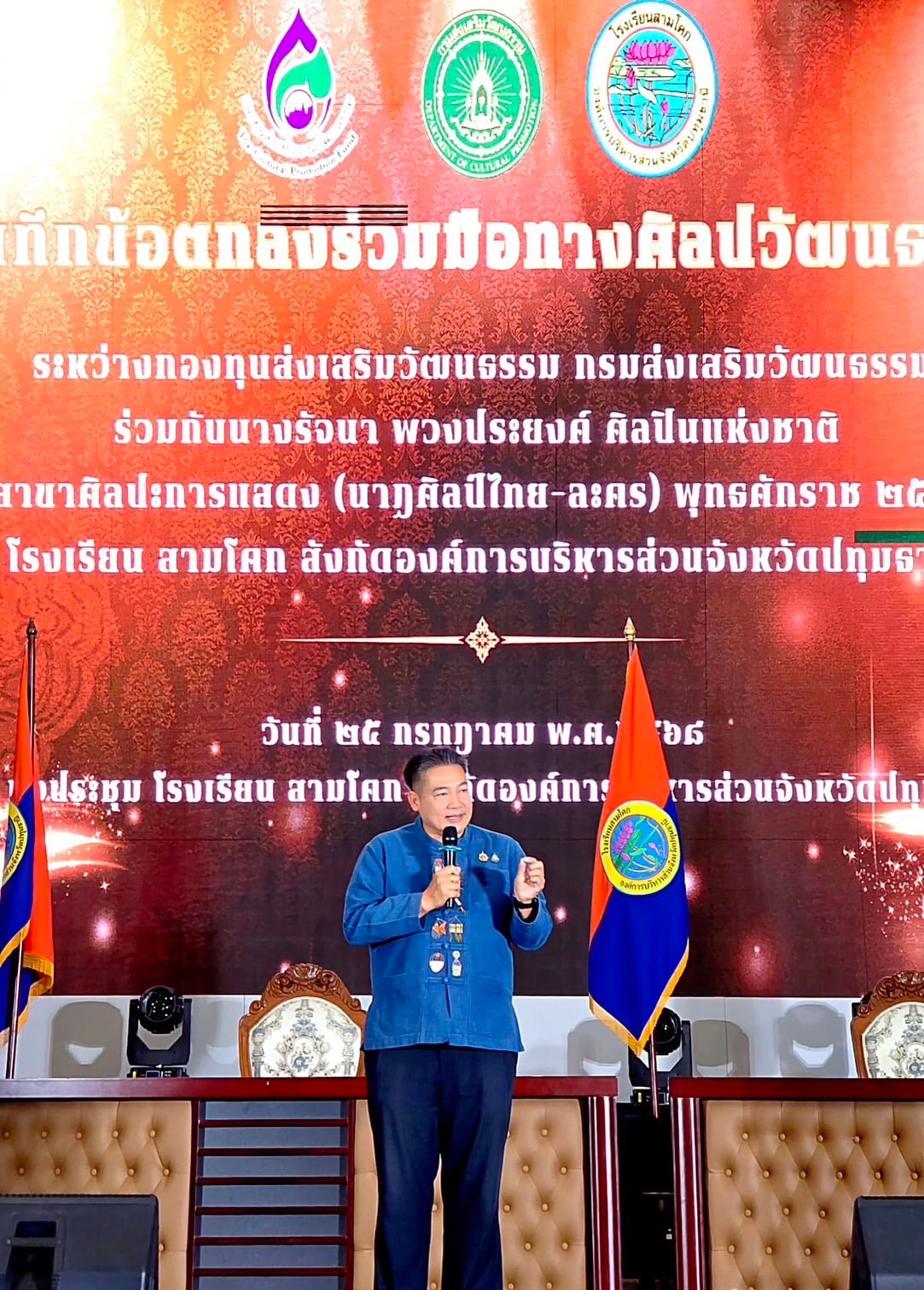 ในการลงนามบันทึกข้อตกลงความร่วมมือทางศิลปวัฒนธรรม (MOU) ในครั้งนี้ ได้รับเกียรติจาก นายอนุสิทธิ์ ศรีอนันต์ ผู้อำนวยการโรงเรียนสามโคก กล่าวต้อนรับ และนายอนุกูล ใบไกล ผู้อำนวยการกองกองทุนส่งเสริมงานวัฒนธรรม ผู้แทนประธานกรรมการกองทุนส่งเสริมงานวัฒนธรรม และอธิบดีกรมส่งเสริมวัฒนธรรม กล่าวถึงบทบาทของกองทุนส่งเสริมงานวัฒนธรรมและวัตถุประสงค์ของการลงนามในครั้งนี้