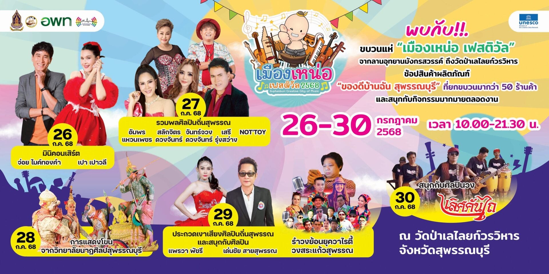 การจัดกิจกรรมการส่งเสริมต่อยอดสุพรรณบุรีเมืองสร้างสรรค์ด้านดนตรียูเนสโก “เมืองเหน่อ เฟสติวัล” จัดขึ้นตั้งแต่วันที่ 26 -30 กรกฎาคม 2568 ตั้งแต่เวลา 10.00 น. - 21.30 น. ณ วัดป่าเลไลย์วรวิหาร อำเภอเมือง จังหวัดสุพรรณบุรี
