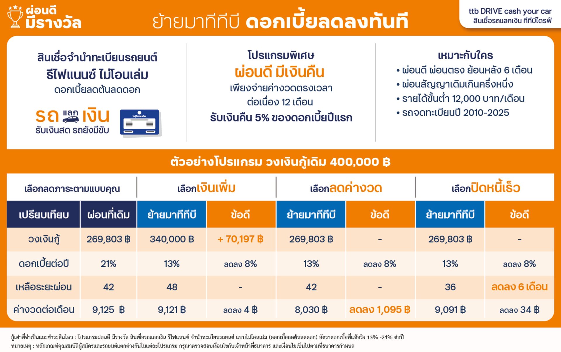 สนใจสินเชื่อรถแลกเงิน รีไฟแนนซ์ย้ายมาทีทีบี “ผ่อนดี...มีรางวัล” ได้ตั้งแต่วันที่ 17 เมษายน 2568 – 31 สิงหาคม 2568 สอบถามข้อมูลเพิ่มเติมและสมัครได้ที่ ทีทีบีทุกสาขา หรือผ่านแอป ttb touch
