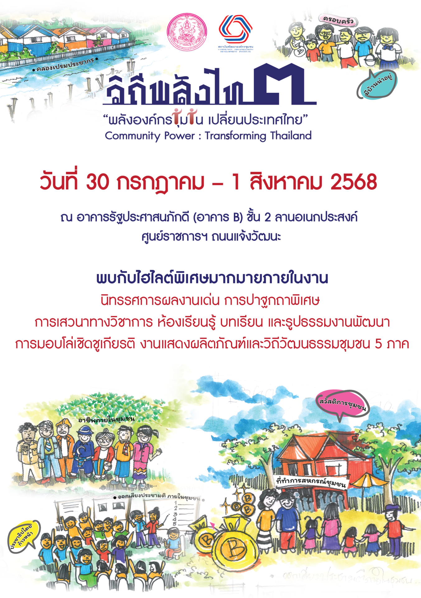 ขอเชิญชวนทุกท่านร่วมเป็นสักขีพยานและสัมผัสพลังอันยิ่งใหญ่ของชุมชนในงาน "มหกรรมวิถีพลังไท 3: พลังองค์กรชุมชน เปลี่ยนประเทศไทย" สถานที่จัดงาน: อาคารรัฐประศาสนภักดี (อาคาร B) ศูนย์ราชการเฉลิมพระเกียรติฯ ถนนแจ้งวัฒนะ แขวงทุ่งสองห้อง เขตหลักสี่ กรุงเทพมหานคร วันและเวลา: ระหว่างวันที่ 30 กรกฎาคม ถึง 1 สิงหาคม 2568 มาร่วมเรียนรู้ สร้างแรงบันดาลใจ และเป็นส่วนหนึ่งของการเปลี่ยนแปลงประเทศไทยไปด้วยกัน