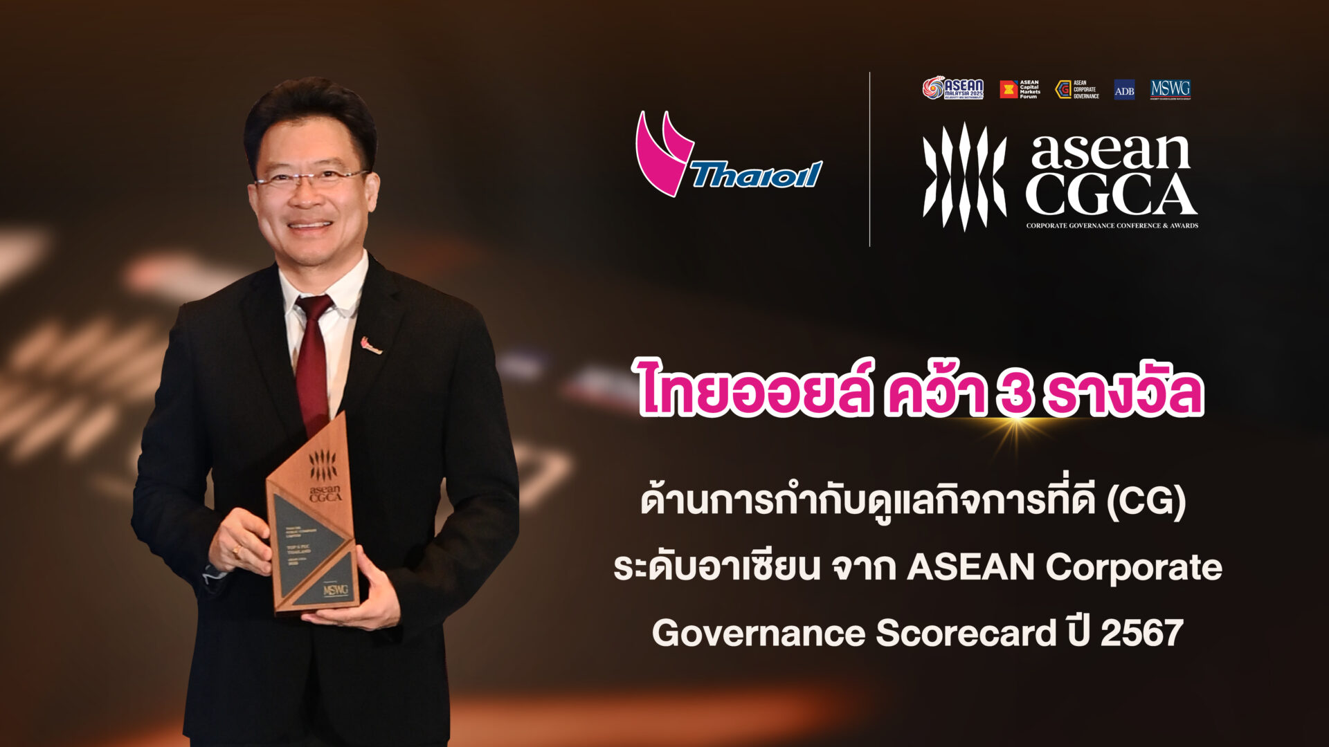 เมื่อเร็วๆ นี้ คุณภูพิงค์ ทวีทรัพย์ ผู้จัดการฝ่ายความยั่งยืนองค์กร บริษัท ไทยออยล์ จำกัด (มหาชน) รับมอบ 3 รางวัล จาก โครงการ ASEAN Corporate Governance Scorecard ปี 2567 ประกอบด้วย รางวัล Country Top 5 PLCs รางวัล ASEAN Top 50 PLCs และ รางวัล ASEAN Asset Class PLCs โดยไทยออยล์ได้รับรางวัลดังกล่าวต่อเนื่องเป็นปีที่ 3 พิธีดังกล่าว จัดขึ้น ณ กรุงกัวลาลัมเปอร์ ประเทศมาเลเซีย