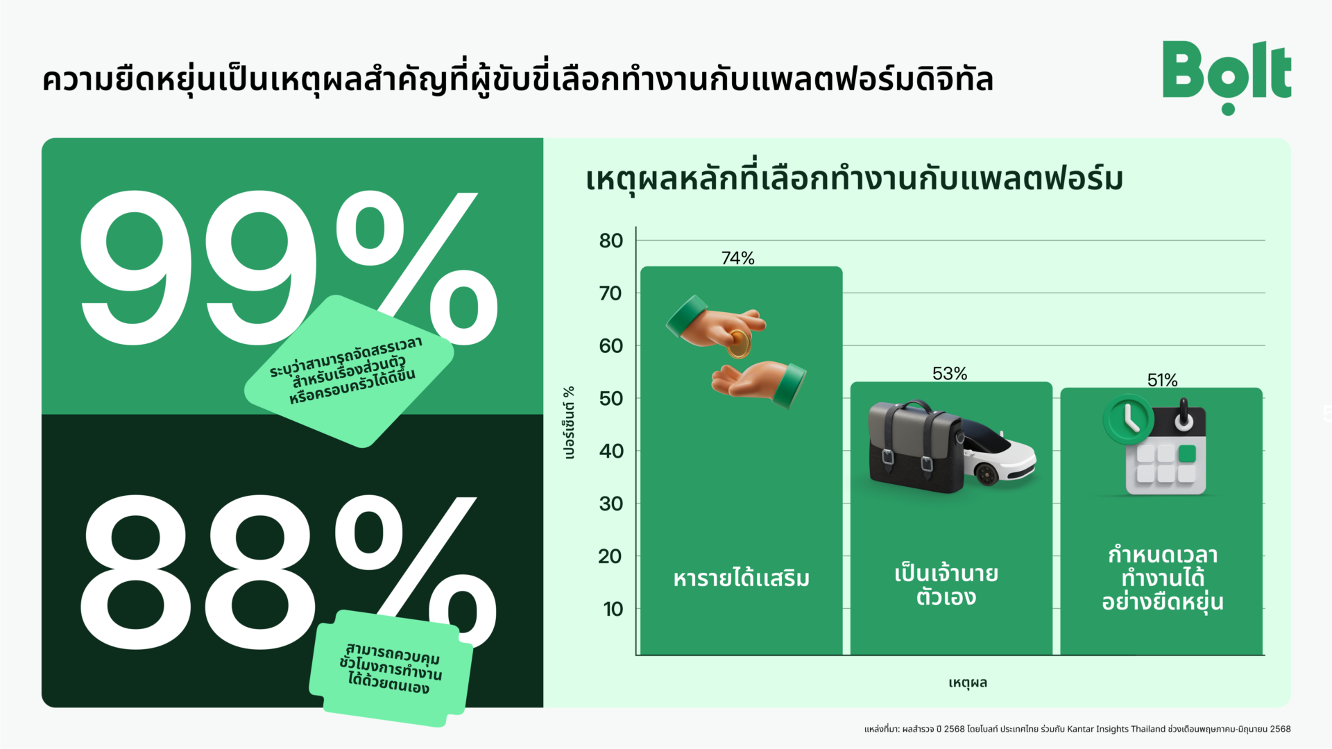 ผลสำรวจระดับประเทศที่จัดทำโดยโบลท์ (Bolt) ร่วมกับ Kantar Insights Thailand บริษัทวิจัยชั้นนำระดับโลกด้านข้อมูลเชิงลึกและที่ปรึกษาทางการตลาด เผยว่า ภาพจำแบบเดิมเกี่ยวกับอาชีพขับรถผ่านแพลตฟอร์ม ride-hailing ไม่สะท้อนความเป็นจริงในยุคปัจจุบันอีกต่อไป โดยผู้ขับที่ทำงานร่วมกับแพลตฟอร์มดิจิทัลส่วนใหญ่รู้สึกว่าตนเองได้รับการยอมรับจากสังคมมากขึ้น มีอิสระในการกำหนดรูปแบบการทำงานของตนเอง และมองว่าอาชีพนี้เป็นทางเลือกที่สามารถสร้างความมั่นคงได้จริง