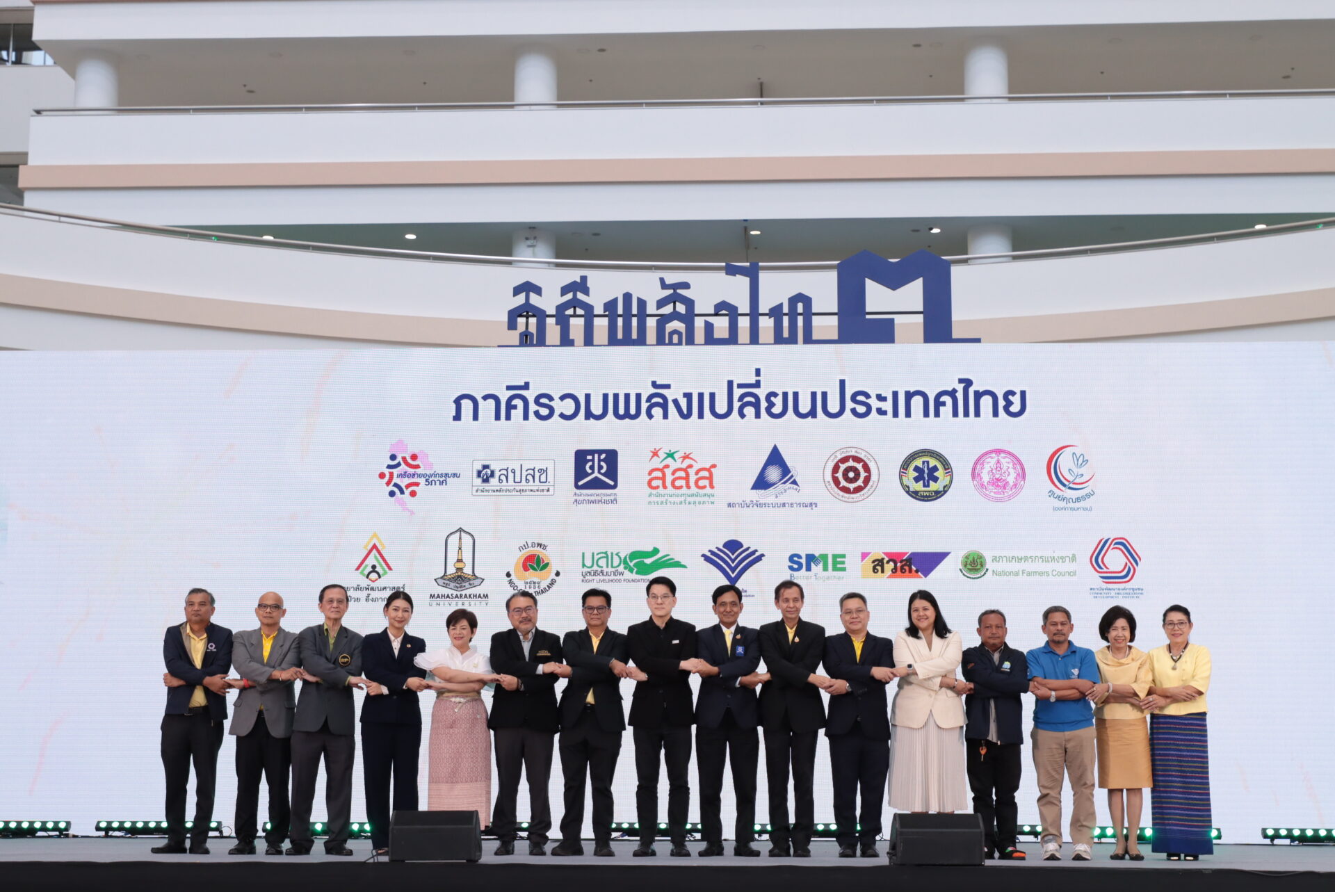 ต่อจากนั้นเป็นช่วงเวลาสำคัญที่แสดงถึงพลังสามัคคี กับเวทีแสดงเจตนารมณ์ “ภาคีรวมพลังเปลี่ยนประเทศไทย” ซึ่งเป็นการรวมตัวของเครือข่ายกว่า 18 องค์กรชั้นนำ ทั้งภาครัฐ ภาคการศึกษา ภาคประชาสังคม และภาคเอกชน อาทิ พอช. สปสช. สสส. นิด้า ม.ธรรมศาสตร์ ม.มหาสารคาม สภาเกษตรกรแห่งชาติ และมูลนิธิต่างๆ ที่พร้อมจับมือขับเคลื่อนประเทศ
