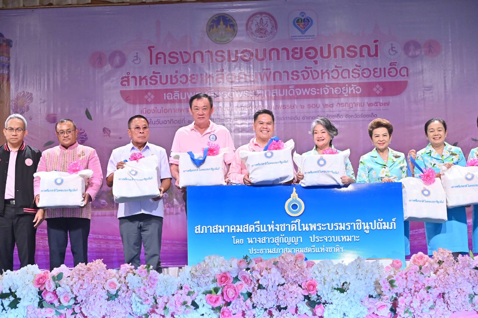 ในโอกาสนี้ ยังมีพิธีรับมอบถุงยังชีพ จำนวน 400 ชุด จากสภาสมาคมสตรีแห่งชาติ ในพระบรมราชินูปถัมภ์ โดยนางสาวสุกัญญา ประจวบเหมาะ ประธานสภาสมาคมสตรีแห่งชาติ ในพระบรมราชินูปถัมภ์ ส่งมอบถุงยังชีพ ให้กับนายอนุรักษ์ จุรีมาศ สมาชิกสภาผู้แทนราษฎรจังหวัดร้อยเอ็ด พรรคชาติไทยพัฒนา ผู้ว่าราชการจังหวัดร้อยเอ็ด รองผู้ว่าราชการจังหวัดร้อยเอ็ด นายกเทศมนตรี และพัฒนาสังคมและความมั่นคงของมนุษย์จังหวัดร้อยเอ็ด เพื่อนำไปส่งมอบความช่วยเหลือต่อไปยังกลุ่มเปราะบางที่ประสบปัญหาความเดือดร้อนต่างๆ อีกทั้งมีการมอบเงินสงเคราะห์คนไร้ที่พึ่ง โดยกรมพัฒนาสังคมและสวัสดิการ กระทรวง พม. จำนวน 74 ราย