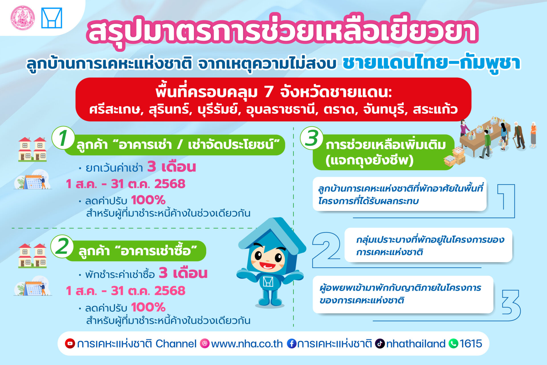 นายทวีพงษ์ วิชัยดิษฐ ผู้ว่าการการเคหะแห่งชาติ เปิดเผยเมื่อวันที่ 4 สิงหาคม 2568 การเคหะแห่งชาติพร้อมยืนเคียงข้างประชาชนในยามวิกฤติ ด้วยมาตรการช่วยเหลืออย่างเป็นรูปธรรม เพื่อบรรเทาภาระค่าใช้จ่ายด้านที่อยู่อาศัย และส่งเสริมความมั่นคงในการดำรงชีวิตของผู้ได้รับผลกระทบมาตรการเร่งด่วนให้ลูกบ้านของการเคหะแห่งชาติใน 7 จังหวัดชายแดน ได้แก่ ศรีสะเกษ สุรินทร์ บุรีรัมย์ อุบลราชธานี ตราด จันทบุรี และสระแก้ว ครอบคลุมความช่วยเหลือหลัก 3 ด้าน ได้แก่ 1. ยกเว้นค่าเช่ารายย่อยและเช่าจัดประโยชน์สำหรับลูกค้าการเคหะแห่งชาติ ฟรีค่าเช่า 3 เดือน ตั้งแต่ 1 สิงหาคม – 31 ตุลาคม 2568 รวมถึงยกเว้นค่าปรับ 100% สำหรับผู้ที่มาชำระหนี้ค้าง ในช่วงเวลาดังกล่าว 2. พักชำระหนี้กลุ่มเช่าซื้อ ลูกค้าเช่าซื้ออาคารของการเคหะแห่งชาติในพื้นที่ที่ได้รับผลกระทบ จะได้รับสิทธิพักชำระค่าเช่าซื้อ 3 เดือน ตั้งแต่ 1 สิงหาคม – 31 ตุลาคม 2568 พร้อมยกเว้นค่าปรับ 100% กรณีที่มาชำระหนี้ค้างเช่นเดียวกัน 3. สนับสนุนการยังชีพ การเคหะแห่งชาติได้จัดเตรียมถุงยังชีพเพื่อช่วยเหลือ 3 กลุ่มหลัก ได้แก่ 1) ลูกค้าที่พักอาศัยในโครงการของการเคหะแห่งชาติในพื้นที่ชายแดน 2) กลุ่มเปราะบางที่อยู่ในโครงการ 3) ผู้ที่อพยพเข้ามาพักอาศัยกับญาติในโครงการเนื่องจากสถานการณ์ความไม่สงบดังกล่าว