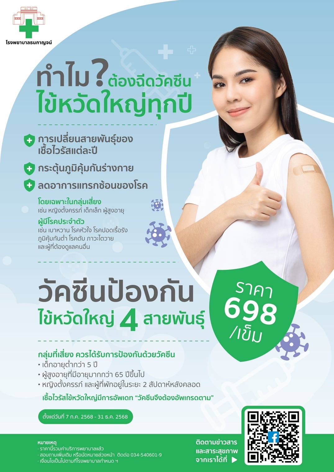 พิเศษ! โรงพยาบาลธนกาญจน์ ได้จัดกิจกรรมส่งเสริมการขาย ให้บริการวัคซีนไข้หวัดใหญ่ 4 สายพันธุ์ ในราคา 698 บาท และวัคซีนไข้เลือดออก 2 เข็ม ในราคา 4,198 บาท ตั้งแต่วันนี้ ถึง 31 ธันวาคม 2568 นี้