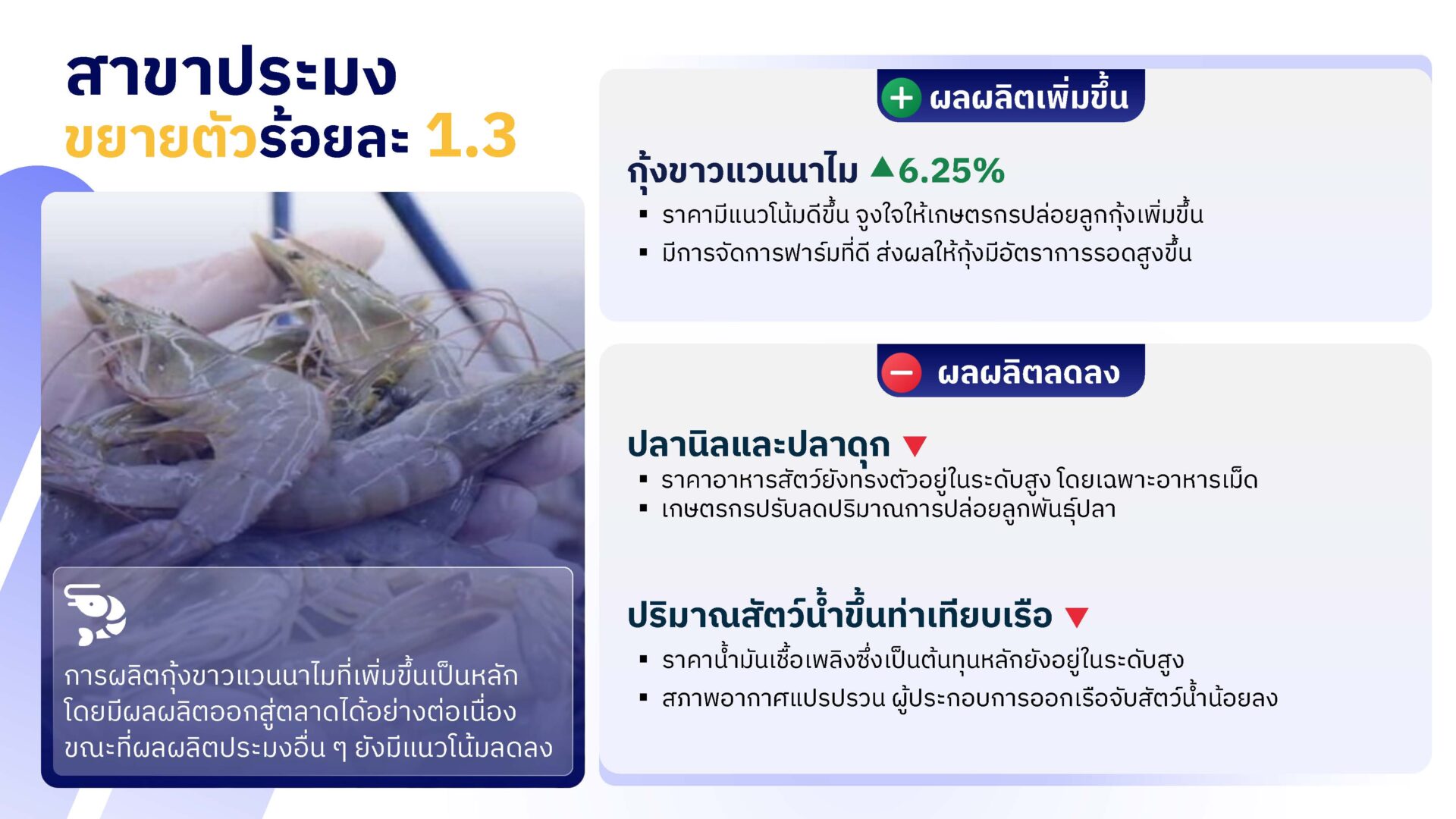 สาขาประมง ขยายตัวร้อยละ 1.3 โดยกุ้งขาวแวนนาไม ซึ่งเป็นสินค้าหลักในสาขานี้ มีผลผลิตออกสู่ตลาดเพิ่มขึ้นอย่างต่อเนื่อง เนื่องจากราคากุ้งมีแนวโน้มสูงขึ้น จูงใจให้เกษตรกรปรับเพิ่มปริมาณการปล่อยลูกกุ้ง ประกอบกับมีการบริหารจัดการฟาร์มที่ดี ทำให้กุ้งมีอัตราการรอดสูง ส่วนปลานิล ปลาดุก และสัตว์น้ำที่นำขึ้นท่าเทียบเรือ ผลผลิตลดลง เนื่องจากราคาอาหารสัตว์น้ำซึ่งเป็นต้นทุนการผลิตหลักยังทรงตัวอยู่ในระดับสูง ทำให้เกษตรกรปรับลดปริมาณการปล่อยลูกพันธุ์ปลา ขณะที่การทำประมงทะเล ต้องเผชิญกับสภาพอากาศที่แปรปรวน และต้นทุนด้านน้ำมันเชื้อเพลิงที่ค่อนข้างสูง ทำให้ผู้ประกอบการประมงมีการออกเรือจับสัตว์น้ำลดลง