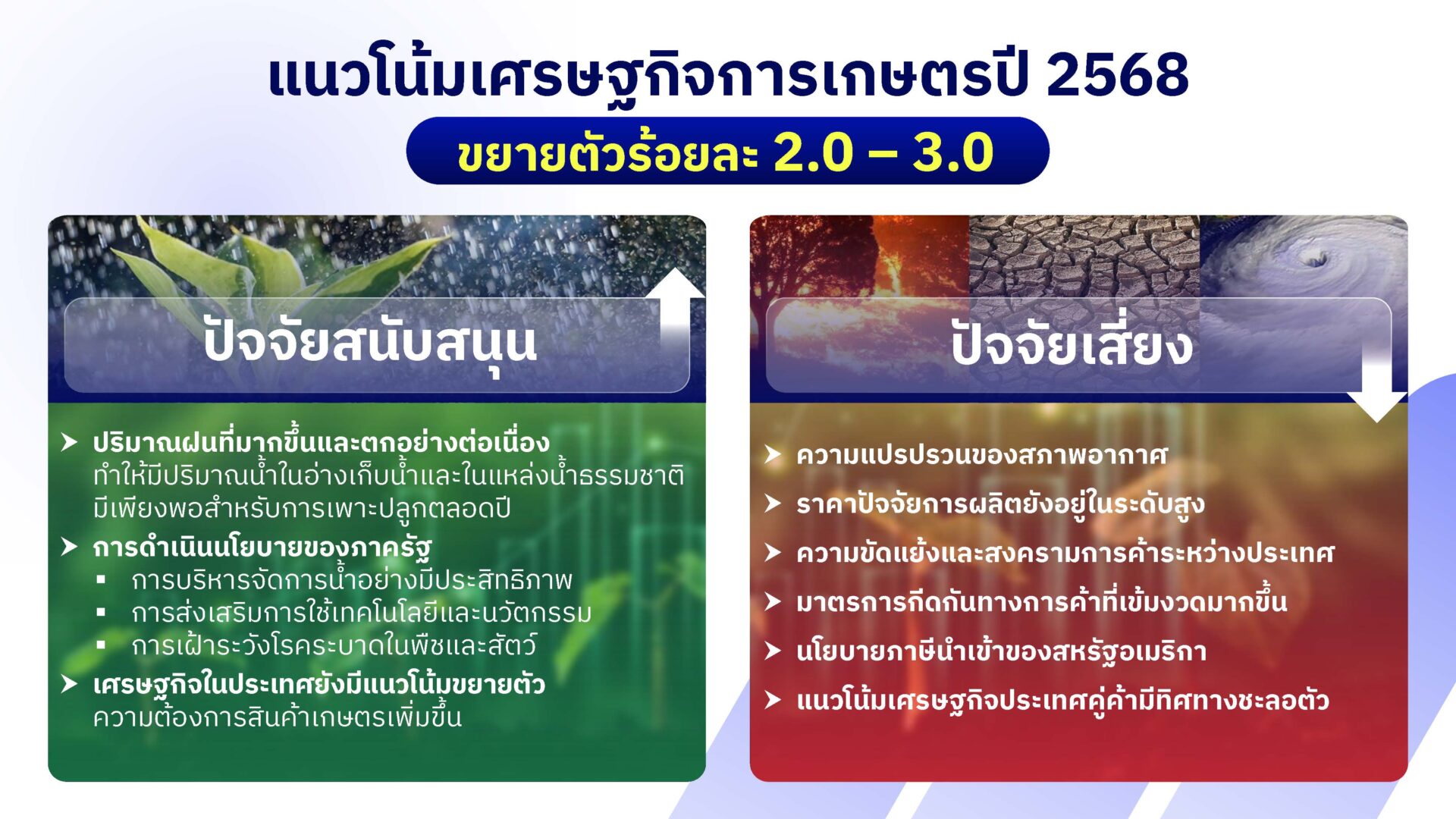สำหรับแนวโน้มเศรษฐกิจการเกษตรทั้งปี 2568 คาดว่าจะขยายตัวอยู่ในช่วงร้อยละ 2.0 – 3.0 เมื่อเทียบกับ ปี 2567 โดยมีปัจจัยสนับสนุนจากปริมาณฝนที่มากขึ้นและตกอย่างต่อเนื่อง ทำให้ปริมาณน้ำในอ่างเก็บน้ำและแหล่งน้ำธรรมชาติมีเพียงพอสำหรับการเพาะปลูกตลอดปี ประกอบกับมีการดำเนินนโยบายของภาครัฐในการขับเคลื่อนการพัฒนาการเกษตร รวมทั้งการแก้ไขปัญหาด้านการเกษตรอย่างต่อเนื่อง อาทิ การบริหารจัดการน้ำอย่างมีประสิทธิภาพ การส่งเสริมการใช้เทคโนโลยีและนวัตกรรม เพื่อเพิ่มศักยภาพการผลิตและยกระดับสินค้าเกษตรให้ได้คุณภาพและมาตรฐาน การเฝ้าระวังโรคระบาดในพืชและสัตว์ อย่างไรก็ตาม ยังคงมีปัจจัยเสี่ยงที่ต้องติดตามอย่างใกล้ชิด ได้แก่ ความแปรปรวนของสภาพอากาศ ราคาปัจจัยการผลิตที่ยังอยู่ในระดับสูง ขณะที่ราคาสินค้าเกษตรหลายชนิดมีทิศทางลดลง รวมถึงปัจจัยภายนอก อาทิ ความขัดแย้งและสงครามการค้าระหว่างประเทศ มาตรการกีดกันทางการค้าที่เข้มงวดมากขึ้น และนโยบายภาษีนำเข้าของสหรัฐอเมริกา อาจทำให้เศรษฐกิจโลกและเศรษฐกิจของประเทศคู่ค้าสำคัญชะลอตัวลง ส่งผลกระทบต่อการส่งออกสินค้าเกษตรและผลิตภัณฑ์ของไทย และส่งผลต่อเนื่องมายังปริมาณการผลิตและราคาสินค้าเกษตรภายในประเทศ