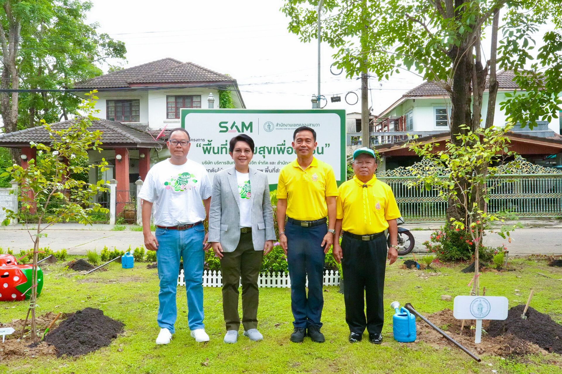พร้อมกันนี้ SAM ยังจัดกิจกรรม “SAM พื้นที่ความสุขเพื่อชุมชน” บริเวณพื้นที่ส่วนกลางและสนามเด็กเล่นในโครงการหมู่บ้าน เค.ซี. การ์เด้นท์ โฮม 3 ซึ่งเดิมเป็นทรัพย์สินรอการขายหรือ NPA ที่ SAM บริจาคให้แก่ชุมชนเมื่อปี 2563 โดยปลูกไม้ยืนต้นและไม้ประดับเพื่อเพิ่มพื้นที่สีเขียวและออกซิเจน พร้อมปรับปรุงภูมิทัศน์โดยทาสีรั้ว เวทีแอโรบิคและเครื่องเล่นสนามต่าง ๆ ให้มีสีสันสวยงามสดใส ปลอดภัย น่าใช้งาน เหมาะสมเป็นพื้นที่แห่งการเรียนรู้และเพิ่มพัฒนาการของเด็กๆ รวมถึงการใช้ประโยชน์ร่วมกันของชาวชุมชน โดยภายในงานมีคณะผู้บริหาร พนักงานจิตอาสาจาก SAM และพันธมิตรที่สำคัญ ได้แก่ สำนักงานเขตคลองสามวา ตัวแทนชาวบ้านชุมชน เค.ซี. การ์เด้นท์ โฮมมากกว่า 200 คน และเด็กนักเรียนจิตอาสาจากโรงเรียนนวมินทราชินูทิศ สตรีวิทยา 2 ประมาณ 50 คนที่มาร่วมปลูกต้นไม้และรับของเล่นเป็นรางวัลแห่งการทำความดีในครั้งนี้ด้วย นับเป็นกิจกรรมที่สร้างความสุขแก่ครอบครัวของคนในชุมชนที่เป็นหน่วยเล็กที่สุดให้มีความเข้มแข็งและเป็นจุดเริ่มต้นของการสร้างสังคมที่ยั่งยืน