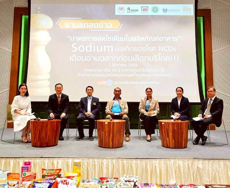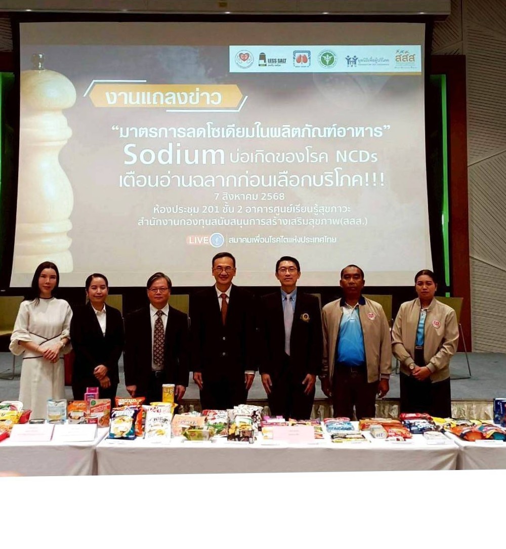 สมาคมเพื่อนโรคไตแห่งประเทศไทย : นายกสมาคมเพื่อนโรคไตแห่งประเทศไทย ร่วมกับเครือข่ายลดบริโภคเค็ม สมาคมโรคไตแห่งประเทศไทย มูลนิธิเพื่อผู้บริโภค กระทรวงสาธารณสุข และสำนักงานกองทุนสนับสนุนการสร้างเสริมสุขภาพ (สสส.) ภายใต้โครงการสำรวจข้อมูลโภชนาการในผลิตภัณฑ์อาหาร 2567 สุ่มสำรวจอ่านฉลากค่าโซเดียมกลุ่มขนมขบเคี้ยว จำนวน จำนวน 352 ตัวอย่าง กลุ่มอาหารแช่เย็น แช่แข็งสำหรับอุ่นร้อนพร้อมรับประทาน จำนวน 60 ตัวอย่าง และกลุ่มอาหารสำเร็จรูป (อาหารพร้อมบริโภคและอาหารกระป๋อง) จำนวน 48 ตัวอย่าง ได้จัดแถลงข่าวมาตรการลดโซเดียมในผลิตภัณฑ์อาหาร สถานการณ์และผลสุ่มสำรวจโซเดียม กลุ่มขนมขบเคี้ยว กลุ่มอาหารแช่เย็น-แช่แข็ง และกลุ่มอาหารสำเร็จรูป ปี 2568 เพื่อให้ผู้บริโภครู้เท่าทันการอ่านฉลากและเตือนภัยใกล้ตัว Sodium คือบ่อเกิดของโรค NCDs เตือนอ่านฉลากก่อนเลือกบริโภค โดยมีวัตถุประสงค์ 1. เพื่อสร้างความตระหนักรู้ความเข้าใจเกี่ยวกับการดูฉลากอาหารและการบริโภคอาหารที่ปลอดภัยต่อสุขภาพ 2. เพื่อรณรงค์ให้เกิดการแก้ไขกฎหมายหรือข้อบังคับเกี่ยวกับการลดปริมาณโซเดียมในอาหาร 3. เพื่อสนับสนุนให้เกิดมาตรการของรัฐเกี่ยวกับการเก็บภาษีโซเดียม เน้นสร้างแรงจูงใจในการปรับสูตรอาหารในทางธุรกิจ 4. เพื่อสำรวจการแสดงข้อมูลโภชนาการและปริมาณโซเดียมบนฉลากอาหารของเครื่องปรุงรส อาหารกึ่งสำเร็จรูป ขนมขบเคี้ยว และประชาสัมพันธ์ให้ประชาชนทราบ