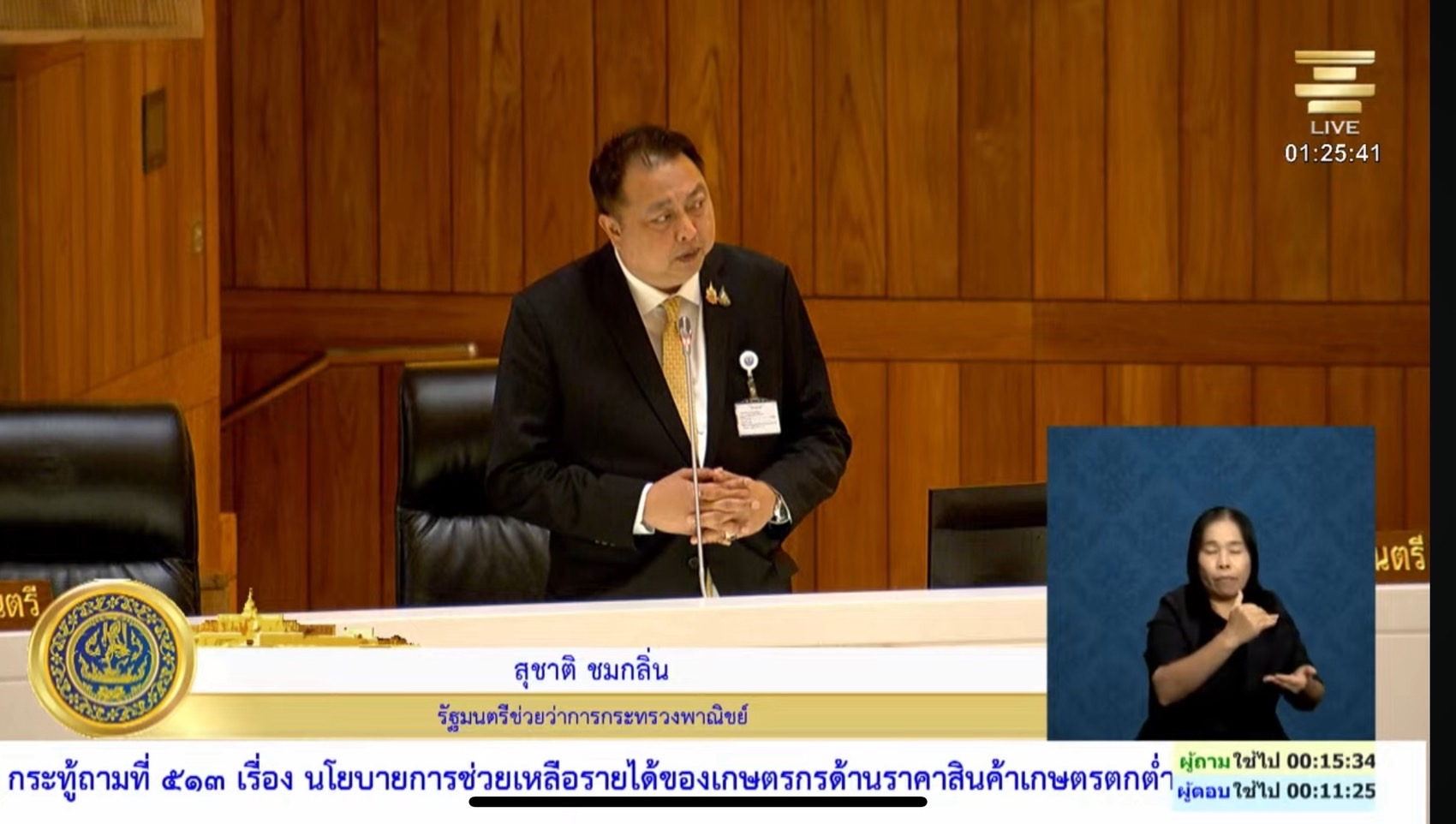 วันที่ 21 สิงหาคม 2568 นายสุชาติ ชมกลิ่น รัฐมนตรีช่วยว่าการกระทรวงพาณิชย์ ได้รับมอบหมายจากนายจตุพร บุรุษพัฒน์ รัฐมนตรีว่าการกระทรวงพาณิชย์ ชี้แจงแทนนายกรัฐมนตรี ต่อที่ประชุมสภาผู้แทนราษฎรได้มีการพิจารณากระทู้ถามสดจากสมาชิกสภาผู้แทนราษฎรเกี่ยวกับแนวนโยบายในการควบคุมและบังคับใช้กฎหมายกับร้านค้าต่างชาติบนแพลตฟอร์มอีคอมเมิร์ซ และการแก้ปัญหาสินค้าเกษตรราคาตกต่ำ