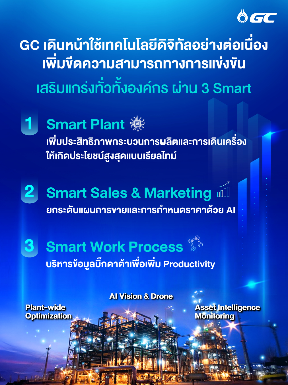 GC ได้เดินหน้าทรานส์ฟอร์มองค์กรผ่านแนวทางการเพิ่มประสิทธิภาพแบบองค์รวม หรือ Holistic Optimization ควบคู่กับการนำนวัตกรรมและเทคโนโลยีดิจิทัลมาประยุกต์ใช้ในทุกมิติ ซึ่งครอบคลุม 3 ด้านหลัก ได้แก่
