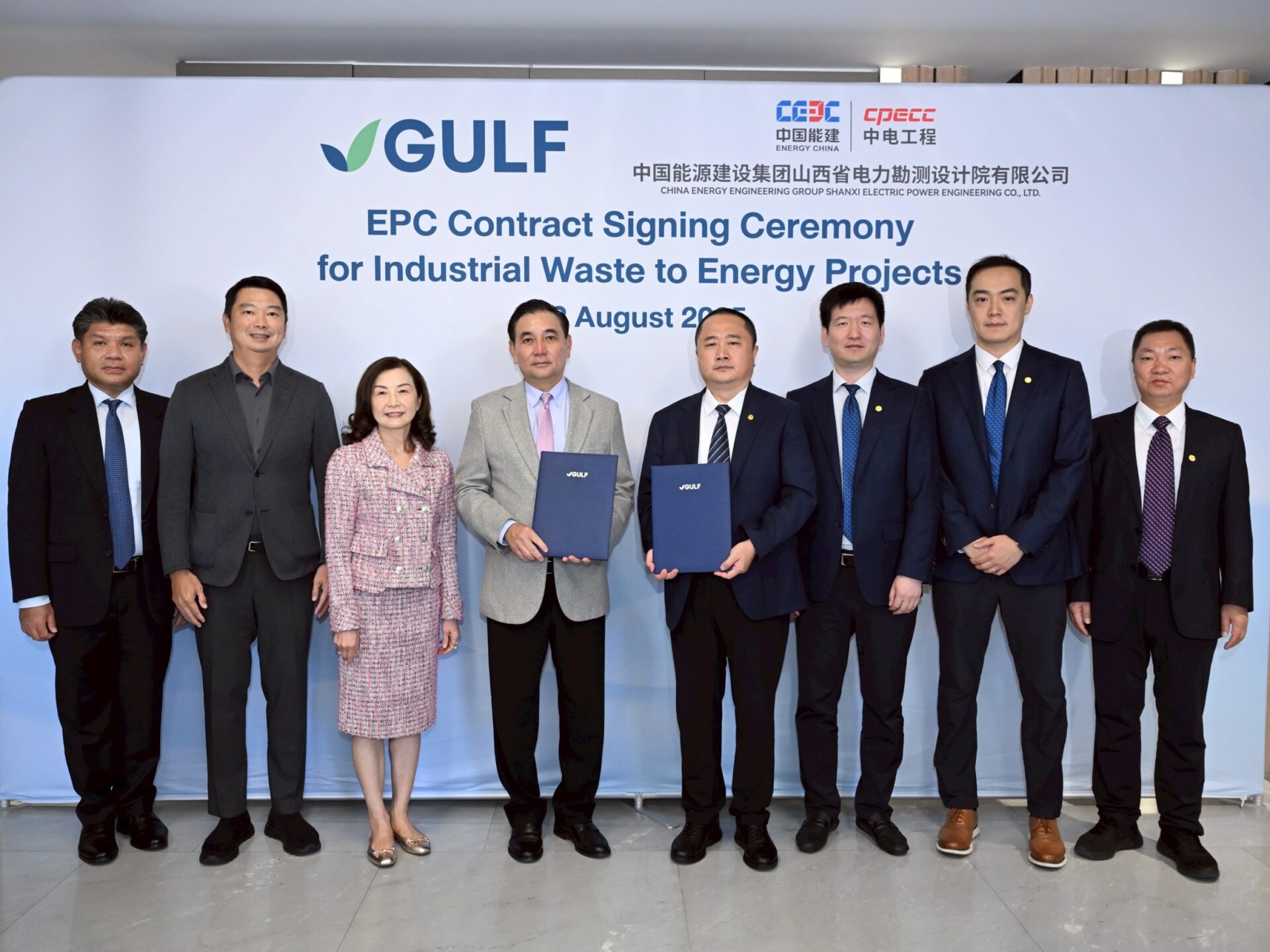 บริษัท กัลฟ์ ดีเวลลอปเมนท์ จำกัด (มหาชน) หรือ GULF นำโดย นายสารัชถ์ รัตนาวะดี ประธานเจ้าหน้าที่บริหาร GULF เดินหน้าสู่เป้าหมายการจัดการขยะอย่างยั่งยืน ร่วมลงนามสัญญากับสองพันธมิตรระดับโลก ได้แก่ บริษัท เอ็นเนอร์จี้ ไชน่า (ประเทศไทย) จำกัด และ บริษัท ไชน่า พาวเวอร์ เอนจิเนียริ่ง คอนซัลแตนท์ กรุ๊ป อินเตอร์เนชั่นแนล เอ็นจิเนียริ่ง จำกัด (CPECC-INTER) เพื่อก่อสร้างโครงการโรงไฟฟ้าพลังงานขยะอุตสาหกรรมขนาดเล็กมาก (VSPP) จำนวน 12 โครงการ โดยมี นายหม่า เซี่ยวเฟิง ประธานกรรมการบริหาร บริษัท ซานซี อิเล็คทริค พาวเวอร์ เอนจิเนียริ่ง จำกัด (ซึ่งถือหุ้นใน Energy China 100% และอยู่ในกลุ่มบริษัท CPECC-INTER) เข้าร่วมลงนามในครั้งนี้ พร้อมด้วยผู้บริหารระดับสูงจากทั้งสองฝ่ายร่วมเป็นสักขีพยาน