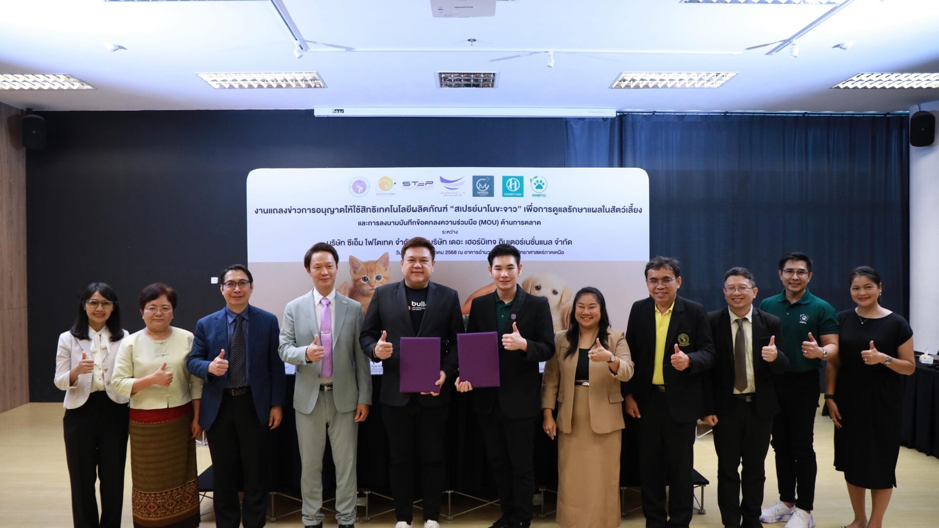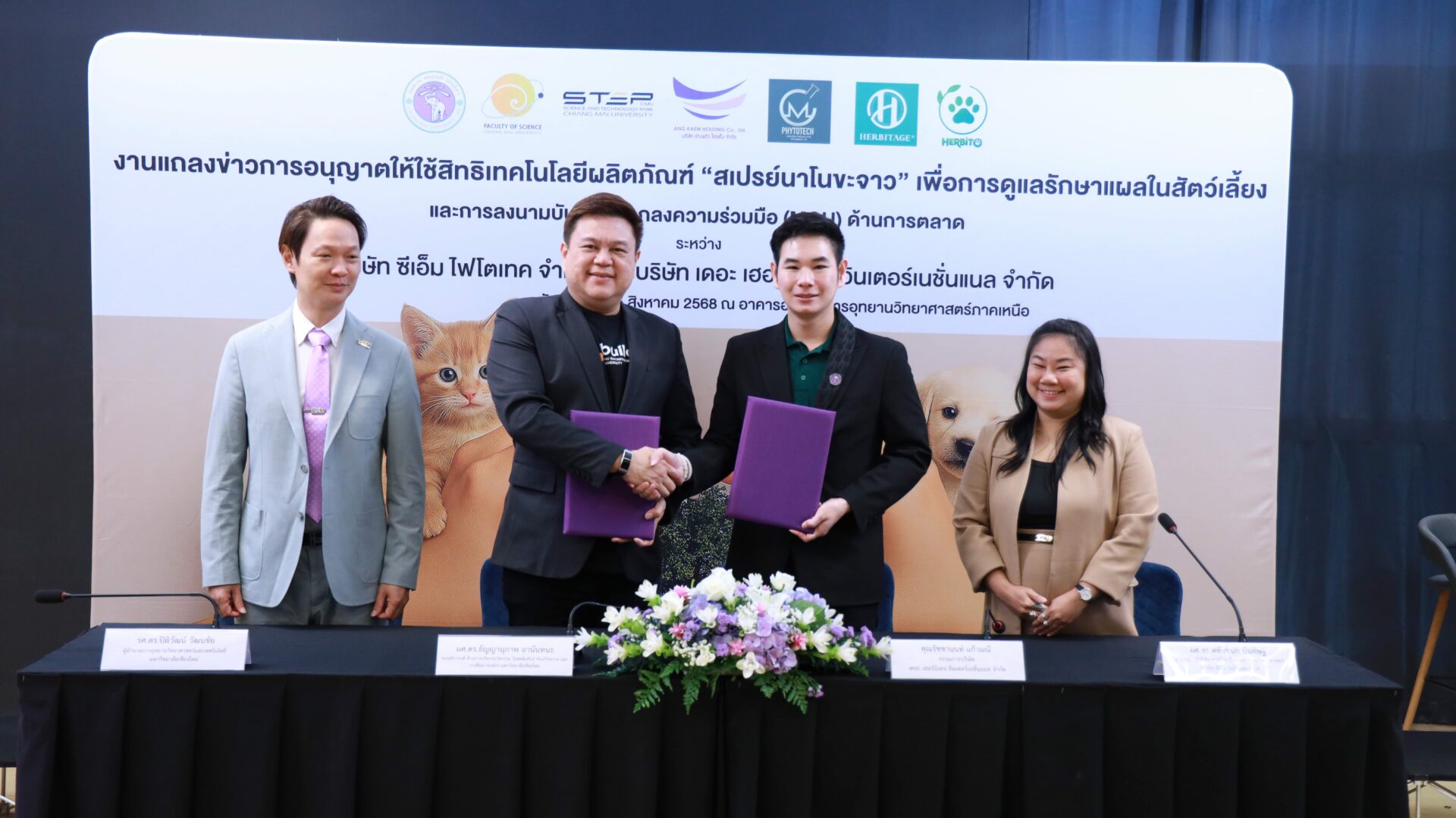 วันจันทร์ที่ 25 สิงหาคม 2568 มหาวิทยาลัยเชียงใหม่ (มช.) จัดงานแถลงข่าวลงนามสัญญาอนุญาตให้ใช้สิทธิเทคโนโลยี “สเปรย์นาโนขะจาว” เพื่อการดูแลรักษาแผลในสัตว์เลี้ยง ระหว่างมหาวิทยาลัยเชียงใหม่และบริษัท เดอะ เฮอร์บิเทจ อินเตอร์เนชั่นแนล จำกัด พร้อมลงนามบันทึกข้อตกลงความร่วมมือ (MOU) ระหว่างบริษัท ซีเอ็ม ไฟโตเทค จำกัด บริษัทในเครือบริษัท อ่างแก้วโฮลดิ้ง จำกัด โฮลดิ้งของมหาวิทยาลัยเชียงใหม่ และบริษัท เดอะ เฮอร์บิเทจ อินเตอร์เนชั่นแนล จำกัด โดยงานนี้ได้รับเกียรติจาก ผศ.ดร.ธัญญานุภาพ อานันทนะ รองอธิการบดี มช. รศ.ดร.ปิติวัฒน์ วัฒนชัย ผู้อำนวยการอุทยานวิทยาศาสตร์และเทคโนโลยี และผศ.ดร.หทัยชนก ปันดิษฐ์ อาจารย์-นักวิจัย ภาควิชาชีววิทยา คณะวิทยาศาสตร์ มช. และผู้ก่อตั้งบริษัทบริษัท ซีเอ็ม ไฟโตเทค จำกัด พร้อมด้วยภาคเอกชน นำโดย คุณรัชชานนท์ แก้วมณี กรรมการบริษัท เดอะ เฮอร์บิเทจ อินเตอร์เนชั่นแนล จำกัด และคณะผู้บริหาร คณาจารย์ มช. เข้าร่วมเป็นสักขีพยาน ณ NSP Exhibition Hall (B1) อาคารอำนวยการอุทยานวิทยาศาสตร์ภูมิภาค ภาคเหนือ (จ.เชียงใหม่)