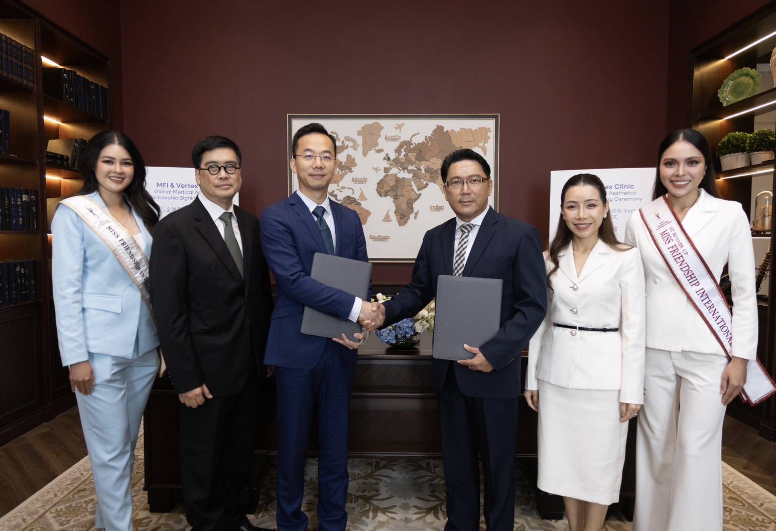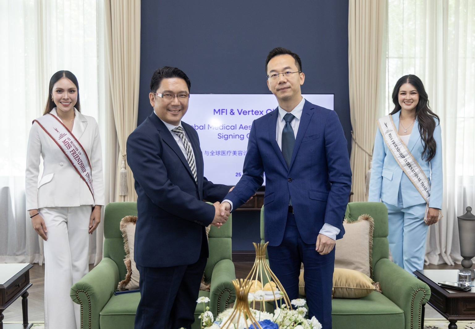 วันที่ 25 สิงหาคม 2568 ณ เรนวูด พาร์ค ได้มีพิธีลงนามความร่วมมือ “MFI & Vertex Clinic Global Medical Aesthetics Partnership Signing Ceremony” ระหว่าง Mr. Jelly Chen (มิสเตอร์ เจลลี่ เฉิน) ประธานกองประกวด Miss Friendship International (MFI) เวทีประกวดสาวงามนานาชาติชื่อดังจากประเทศจีน และเครือข่ายพันธมิตรด้านธุรกิจความงามและเวลเนสในจีน