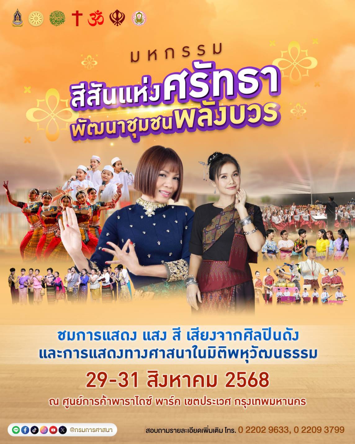 ขอเชิญร่วมงานมหกรรมสุดยิ่งใหญ่แห่งปี “สีสันแห่งศรัทธา พัฒนาชุมชนพลังบวร” ระหว่างวันที่ 29 – 31 สิงหาคม 2568 เวลา 11.00 – 20.00 น. ณ ศูนย์การค้าพาราไดซ์ พาร์ค เขตประเวศ กรุงเทพมหานคร