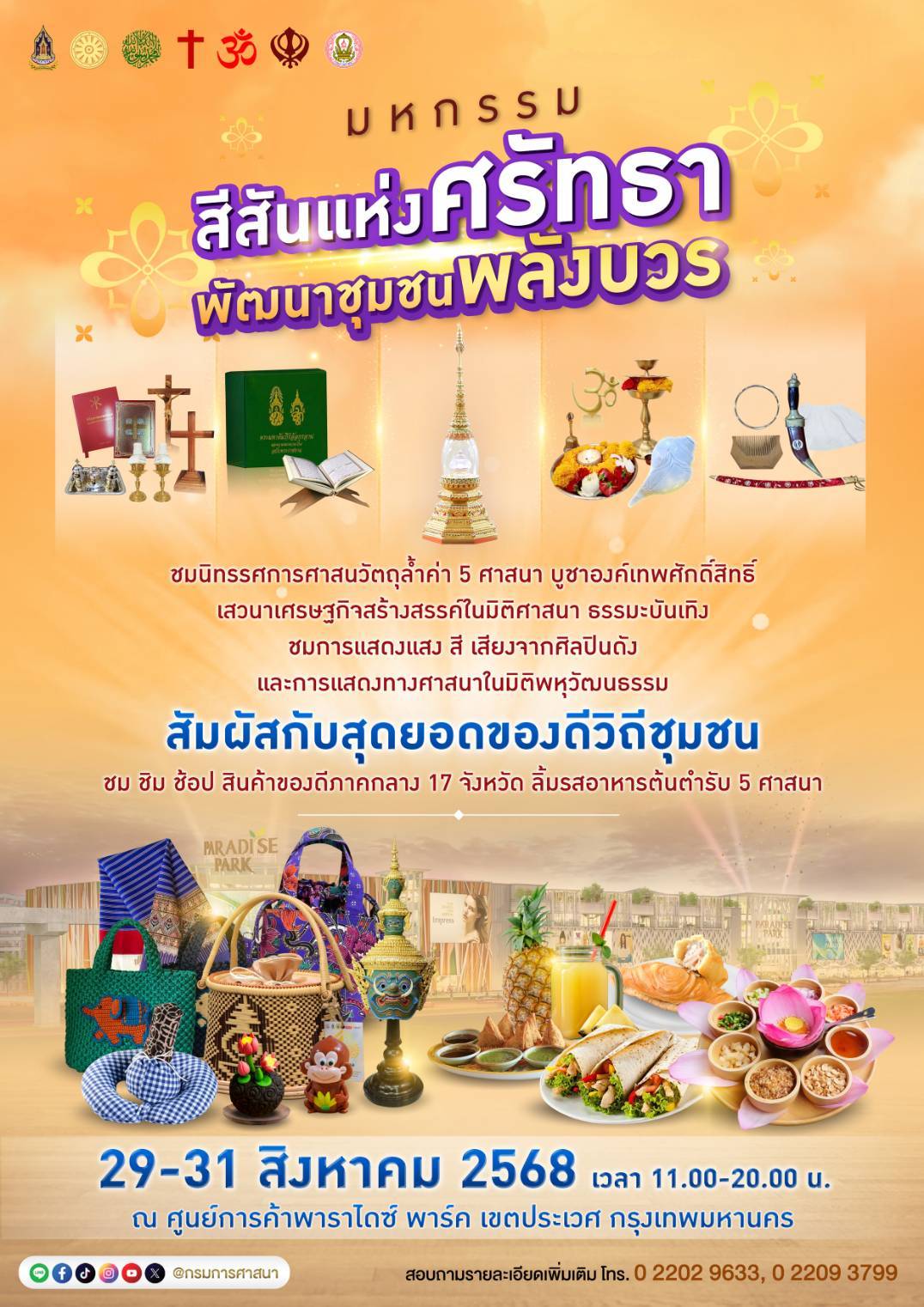 ขอเชิญร่วมงานมหกรรมสุดยิ่งใหญ่แห่งปี “สีสันแห่งศรัทธา พัฒนาชุมชนพลังบวร” ระหว่างวันที่ 29 – 31 สิงหาคม 2568 เวลา 11.00 – 20.00 น. ณ ศูนย์การค้าพาราไดซ์ พาร์ค เขตประเวศ กรุงเทพมหานคร