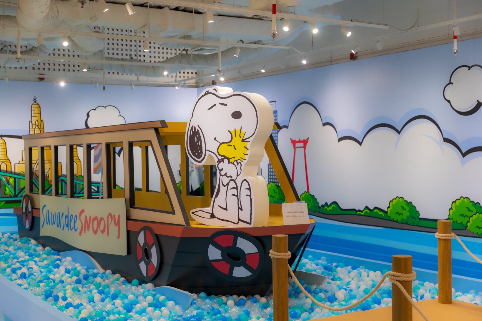 ร่วมเดินทางจินตนาการไปกับเหล่าตัวละครที่เดินทางมาสู่กรุงเทพมหานครผ่านฉากจำลอง ที่ได้รับแรงบันดาลใจจากแม่น้ำ เจ้าพระยาและแลนด์มาร์คสำคัญของกรุงเทพฯ ผสมผสานบรรยากาศของ PEANUTS กับกลิ่นอายของเมืองไทย พร้อมโซนบ่อบอลหลากสีที่ให้ผู้เข้าชมทุกวัยได้ร่วมสนุก