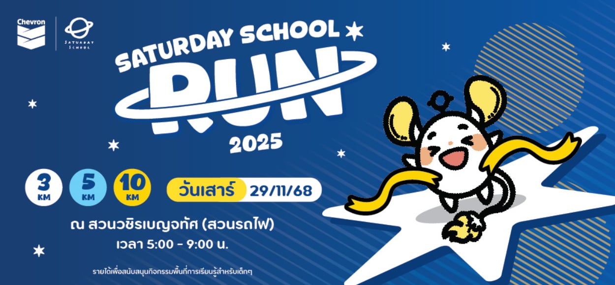 เชฟรอนประเทศไทย ร่วมกับมูลนิธิโรงเรียนวันเสาร์ จัดกิจกรรมวิ่งการกุศล “Saturday School Run 2025: วิ่งด้วยกันเพื่อฝันน้อง” วันที่ 29 พฤศจิกายน 2568 เวลา 5.00 – 9.00 น. ณ สวนวชิรเบญจทัศ (สวนรถไฟ) เพื่อนำรายได้ทั้งหมดโดยไม่หักค่าใช้จ่าย สนับสนุนการพัฒนาทักษะและการเรียนรู้นอกห้องเรียนของเยาวชนทั่วประเทศ