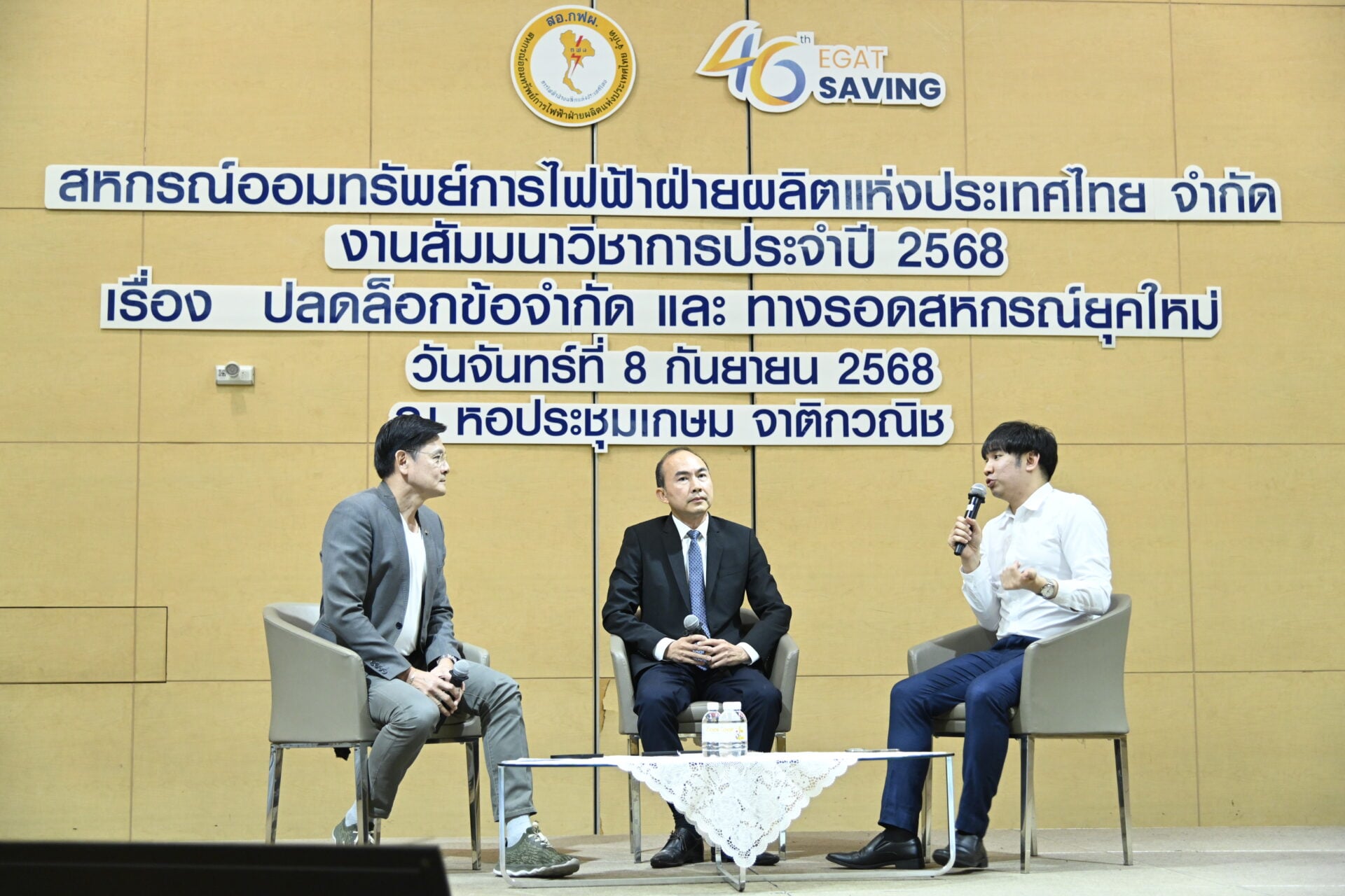 8 กันยายน 2568 สอ.กฟผ. จัดงานสัมมนาวิชาการประจำปี 2568 หัวข้อ “ปลดล็อกข้อจำกัดและทางรอดสหกรณ์ยุคใหม่” เพื่อให้ความรู้เกี่ยวกับกลยุทธ์การลงทุนในตลาดตราสารหนี้-ตราสารทุน รวมถึงกฎหมาย คำแนะนำนายทะเบียนสหกรณ์ที่เป็นข้อจำกัดและกระทบการดำเนินงานของสหกรณ์ โดยมีสมาชิก หน่วยงานภาครัฐ ชุมนุมสหกรณ์ สหกรณ์ออมทรัพย์ต่าง ๆ และสื่อมวลชน เข้าร่วมสัมมนากว่า 400 คน โดยได้รับเกียรติจาก คุณนรินทร์ เผ่าวณิช รักษาการ ผู้ว่าการการไฟฟ้าฝ่ายผลิตแห่งประเทศไทย กล่าวต้อนรับผู้ร่วมสัมมนา ณ หอประชุมเกษมจาติกวณิช 1 - 2 ชั้น 9 อาคาร ต.040 กฟผ.