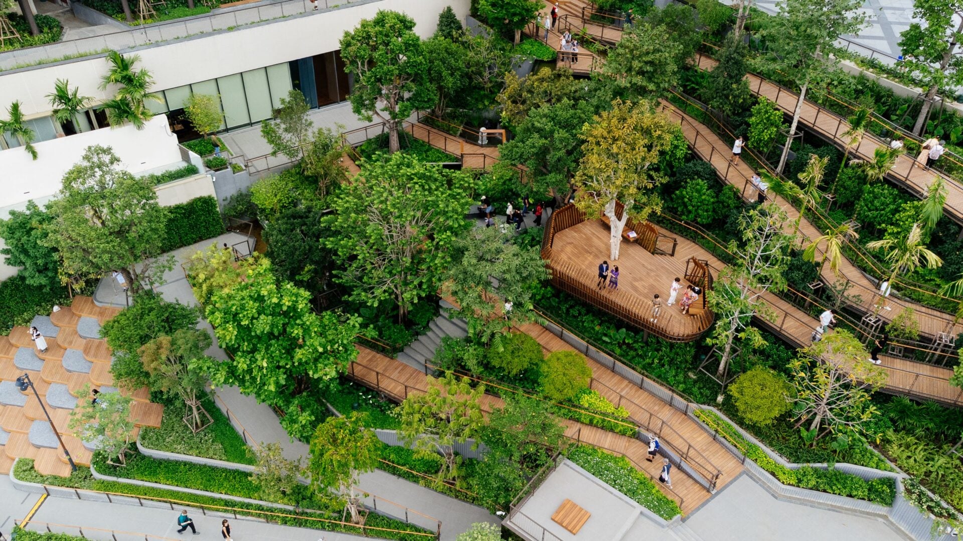 - Roof Park 7 ไร่ – หัวใจสีเขียวใจกลางเมือง: เชื่อมต่อสวนลุมพินีอย่างไร้รอยต่อ ทำหน้าที่เป็น “ปอดใหม่ของคนเมือง” ดูดซับคาร์บอนไดออกไซด์กว่า 11 ตันต่อปี เทียบเท่าต้นไม้ใหญ่กว่า 900 ต้น ออกแบบด้วย Biophilic Design เชื่อมธรรมชาติเข้ากับไลฟ์สไตล์ โดยใช้ พืชพรรณท้องถิ่น เช่น เตย แว่นแก้ว เดหลี หญ้าถอดปล้อง และกกอเมซอน เพื่อช่วยฟอกอากาศและดักจับฝุ่น PM2.5 เสริมความหลากหลายทางชีวภาพในเมือง พร้อมเปิดพื้นที่กิจกรรมสุขภาพและคอมมูนิตี้ อาทิ Run Club, Sunrise Coffee & Tea Rave และ Wellness Experiences ที่ตอบโจทย์คุณภาพชีวิตยุคใหม่