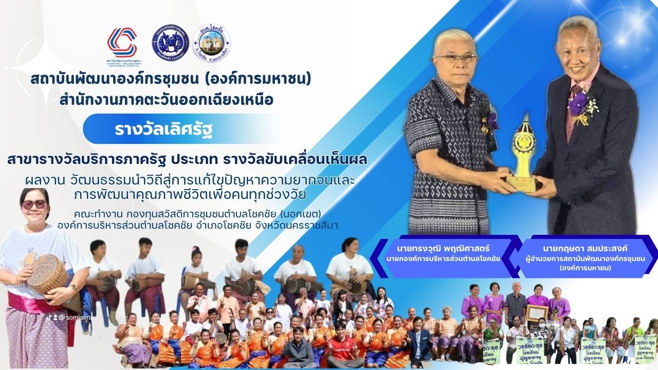 รางวัลเลิศรัฐ สาขาบริการภาครัฐ ระดับดี ประเภทขับเคลื่อนเห็นผล: จากผลงาน “วัฒนธรรมนำวิถีสู่การแก้ไขปัญหาความยากจนและการพัฒนาคุณภาพชีวิตเพื่อคนทุกช่วงวัย” ซึ่งเป็นโครงการที่มุ่งเน้นการใช้มิติทางวัฒนธรรมและภูมิปัญญาท้องถิ่นเป็นเครื่องมือในการสร้างอาชีพ สร้างรายได้ และแก้ไขปัญหาความยากจนในชุมชนอย่างยั่งยืน โดยคำนึงถึงบริบทของแต่ละพื้นที่และความต้องการของประชาชนในแต่ละช่วงวัย ได้แก่ กองทุนสวัสดิการชุมชนตำบลโชคชัย(นอกเขต) องค์การบริหารส่วนตำบลโชคชัย อำเภอโชคชัย จังหวัดนครราชสีมา