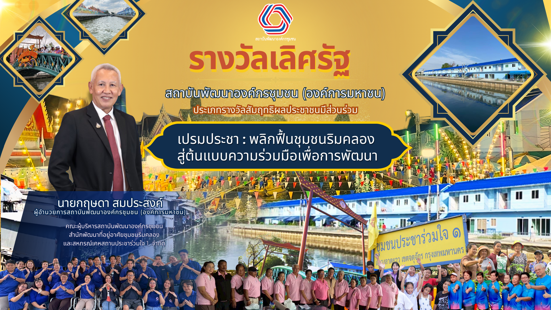รางวัลเลิศรัฐ สาขาการบริหารราชการแบบมีส่วนร่วม ระดับดี: จากผลงาน “เปรมประชา : พลิกฟื้นชุมชนริมคลอง สู่ต้นแบบความร่วมมือการพัฒนา” ซึ่งเป็นโครงการที่โดดเด่นในการสร้างความร่วมมือระหว่างภาครัฐ ชุมชน และภาคีเครือข่าย เพื่อแก้ไขปัญหาที่อยู่อาศัยและการรุกล้ำพื้นที่สาธารณะริมคลองเปรมประชากรอย่างเป็นระบบและเป็นธรรม จนสามารถยกระดับคุณภาพชีวิตของคนในชุมชนและสร้างเป็นต้นแบบการพัฒนาที่สามารถขยายผลได้จริง ได้แก่ ชุมชนประชาร่วมใจ1 เขตจตุจักร กรุงเทพมหานคร