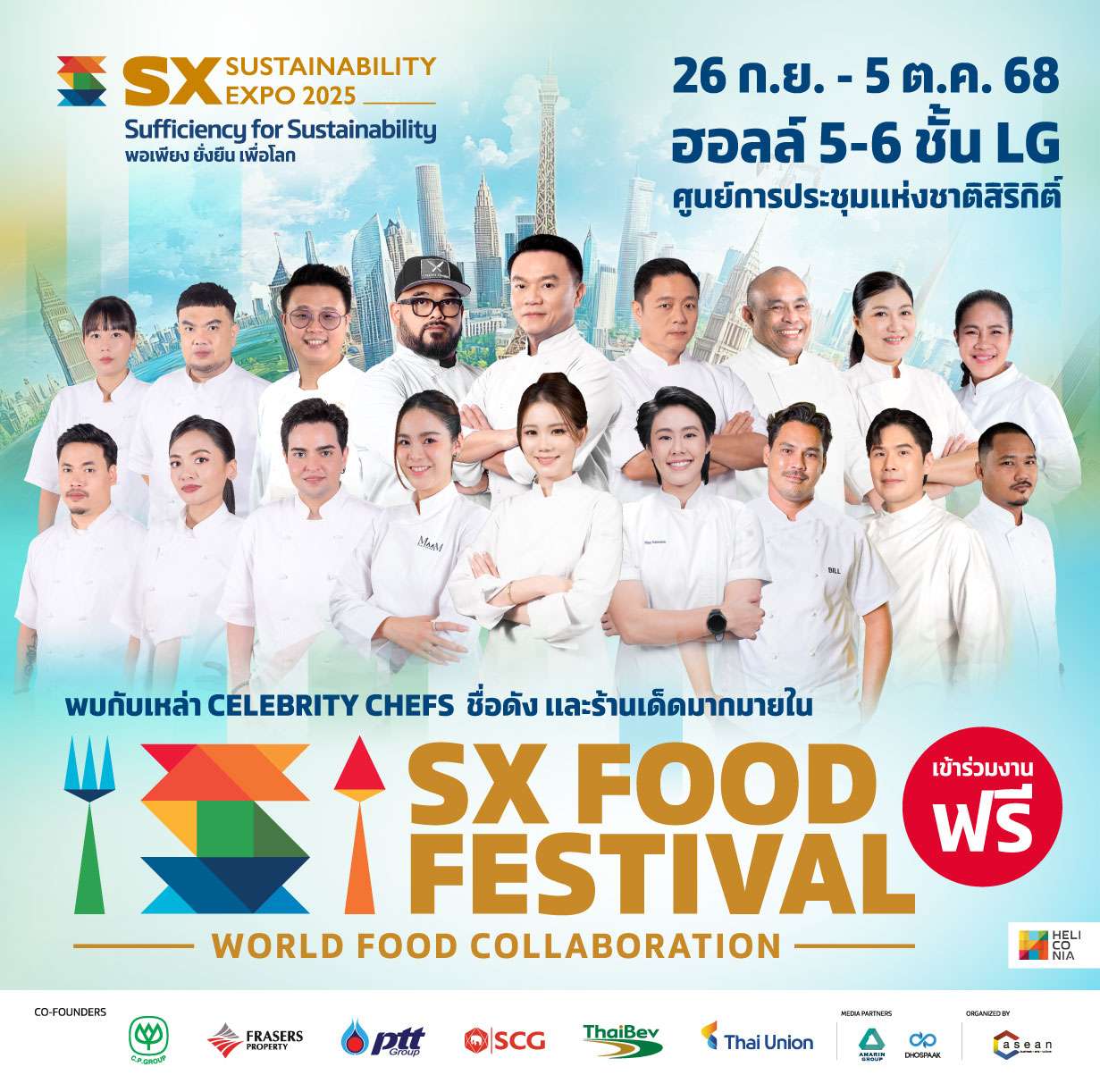มาร่วมสัมผัสความอร่อยกับเทศกาลอาหารเพื่อโลก SX FOOD FESTIVAL ภายใต้มหกรรม ด้านความยั่งยืนที่ใหญ่ที่สุดในอาเซียน Sustainability Expo 2025 (SX2025) เข้าชมงานฟรี !!! 10 วันเต็ม ตั้งแต่ 26 กันยายน - 5 ตุลาคม 2568 เวลา 10.00 – 21.00 น. ณ ศูนย์การประชุมแห่งชาติสิริกิติ์ (QSNCC) ชั้น LG Hall 5-6