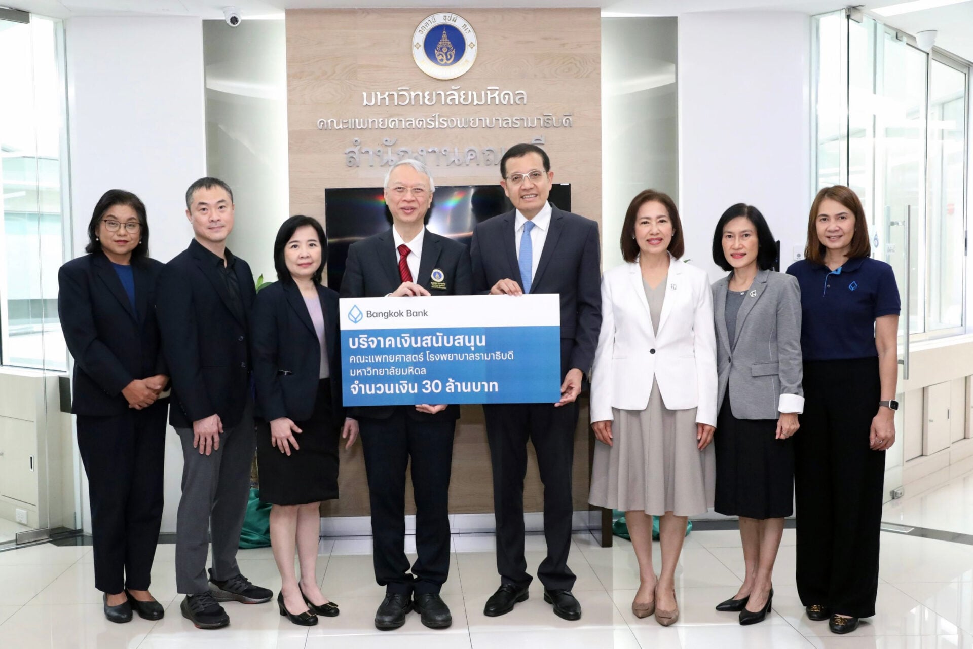 ธนาคารกรุงเทพ จำกัด (มหาชน) นำโดย นายโชค ณ ระนอง ผู้ช่วยผู้จัดการใหญ่ ผู้จัดการสายบัตรเครดิต (ที่ 4 จากขวา) นางสาวพจณี คงคาลัย ผู้ช่วยผู้จัดการใหญ่ บริหารความสัมพันธ์และการขาย ( ที่ 3 จากขวา) นางสาวสุดฤทัย ทองสอง เจ้าหน้าที่บริหารระดับ Senior Vice President สายบัตรเครดิต (ที่ 2 จากขวา) มอบเงินบริจาค จำนวน 30 ล้านบาท แก่ คณะแพทยศาสตร์โรงพยาบาลรามาธิบดี มหาวิทยาลัยมหิดล นำโดย ศาสตราจารย์คลินิก นายแพทย์อาทิตย์ อังกานนท์ คณบดี คณะแพทยศาสตร์โรงพยาบาลรามาธิบดี (ที่ 4 จากซ้าย) รองศาสตราจารย์ ดร.แพทย์หญิงอารีย์พรรณ โสภณสฤษฎ์สุข รองคณบดีฝ่ายการคลัง (ที่ 3 จากซ้าย) ณ สำนักงานคณบดี อาคารบริหาร โรงพยาบาลรามาธิบดีเพื่อสนับสนุนการดำเนินงานของคณะแพทยศาสตร์โรงพยาบาลรามาธิบดี มหาวิทยาลัยมหิดล ในการรักษาพยาบาล วิจัย และพัฒนานวัตกรรมทางการแพทย์ต่อยอดการดูแลสุขภาพคนไทยอย่างมีประสิทธิภาพ ตอกย้ำความมุ่งมั่นของธนาคาร เพื่อร่วมเป็นส่วนหนึ่งของการสร้างคุณภาพชีวิตที่ดีให้กับทุกคนในสังคมไทยอย่างยั่งยืน /