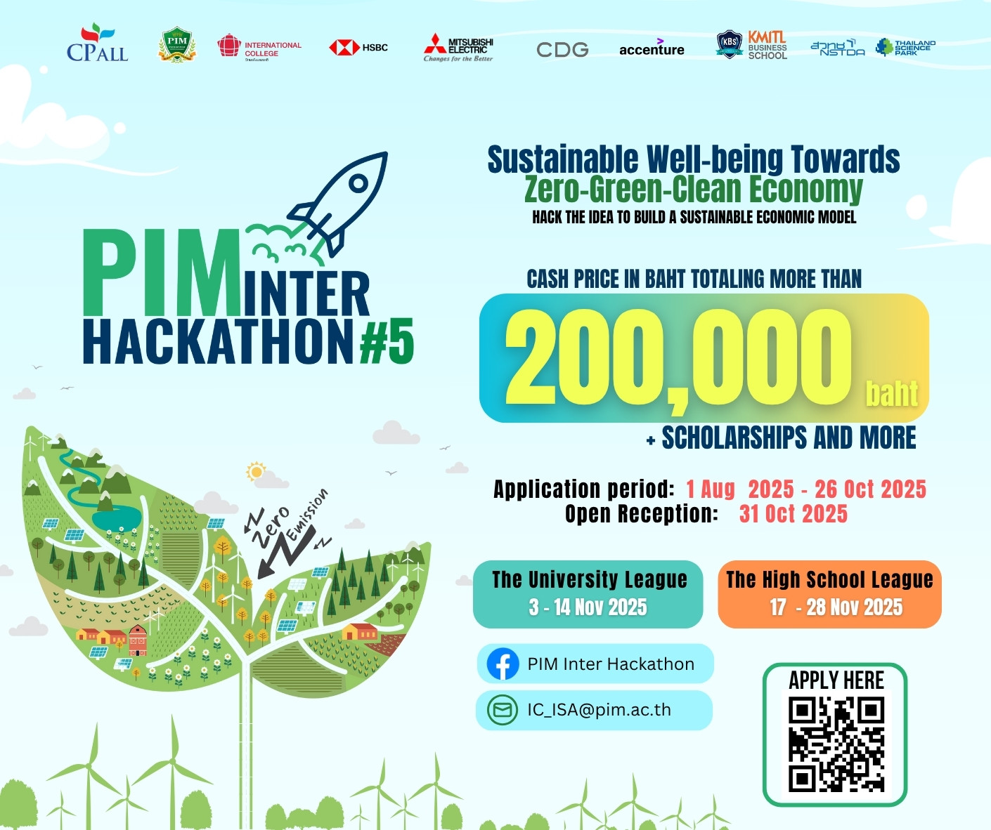 วิทยาลัยนานาชาติ สถาบันการจัดการปัญญาภิวัฒน์ (International College Panyapiwat Institute of Management) ร่วมกับ บริษัท ซีพี ออลล์ จํากัด (มหาชน) – ธนาคารเอชเอสบีซี ประเทศไทย (HSBC Thailand) – บริษัท มิตซูบิชิ อีเล็คทริค แฟคทอรี่ ออโตเมชั่น (ประเทศไทย) จำกัด – กลุ่มบริษัทซีดีจี (CDG Group) - เอคเซนเชอร์ ประเทศไทย (Accenture Thailand) – คณะบริหารธุรกิจ สถาบันเทคโนโลยีพระจอมเกล้าเจ้าคุณทหารลาดกระบัง (KMITL Business School) - สำนักงานพัฒนาวิทยาศาสตร์และเทคโนโลยีแห่งชาติ (สวทช.) และ อุทยานวิทยาศาสตร์ประเทศไทย (Thailand Science Park) เชิญเยาวชนรุ่นใหม่ทั้ง ระดับมัธยมศึกษาตอนปลาย และ อุดมศึกษา ชาวไทยและชาวต่างชาติ เข้าร่วมการแข่งขัน PIM International Hackathon ครั้งที่ 5 ในธีม “Sustainable Well-being towards Zero-Green-Clean Economy” เฟ้นหาสุดยอดไอเดียสร้างสรรค์และนวัตกรรมใหม่ เพื่อขับเคลื่อนสู่ระบบเศรษฐกิจที่ยั่งยืน เปิดโอกาสให้นักเรียนและนักศึกษาได้ออกแบบโมเดลธุรกิจสีเขียวที่เป็นมิตรต่อสิ่งแวดล้อม สร้างสุขภาวะที่ดี และร่วมเสนอแนวทางแก้ไขปัญหาด้วยแนวคิดธุรกิจรูปแบบใหม่ โดยมีเป้าหมายในการลดการปล่อยก๊าซเรือนกระจกให้เป็นศูนย์ และผลักดันสู่การยกระดับระบบเศรษฐกิจสีเขียวอย่างแท้จริง ชิงรางวัลและทุนการศึกษาหลักสูตรบริหารธุรกิจบัณฑิต สาขาวิชาการเป็นผู้ประกอบการธุรกิจสมัยใหม่ หลักสูตรนานาชาติ (iMBE) Bachelor of Business Administration Program in Modern Business Entrepreneurship (International Program) และ หลักสูตรบริหารธุรกิจมหาบัณฑิต (ธุรกิจระหว่างประเทศ) หลักสูตรนานาชาติ Master of Business Administration Program in International Business (iMBA) รวมมูลค่ากว่า 200,000 บาท