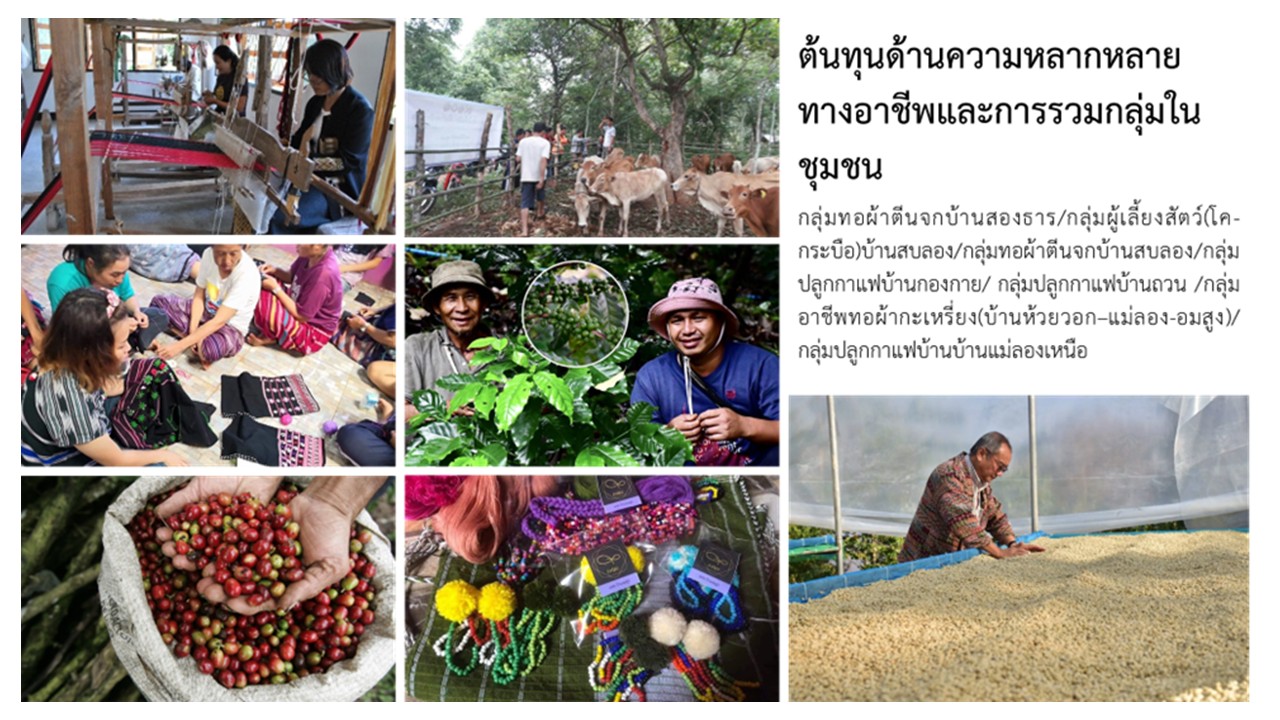 นอกจากเรื่องที่อยู่อาศัยแล้ว ชาวบ้านยังร่วมกันสร้างความมั่นคงในด้านเศรษฐกิจและสิ่งแวดล้อมด้วยการตั้งกลุ่มอาชีพต่างๆ เพื่อเพิ่มรายได้ นอกเหนือจากการทำไร่ข้าวโพด พวกเขาส่งเสริมการ แปรรูปผลิตภัณฑ์ท้องถิ่น เช่น การปลูกกาแฟในป่า การทอผ้าตีนจก และการเลี้ยงสัตว์